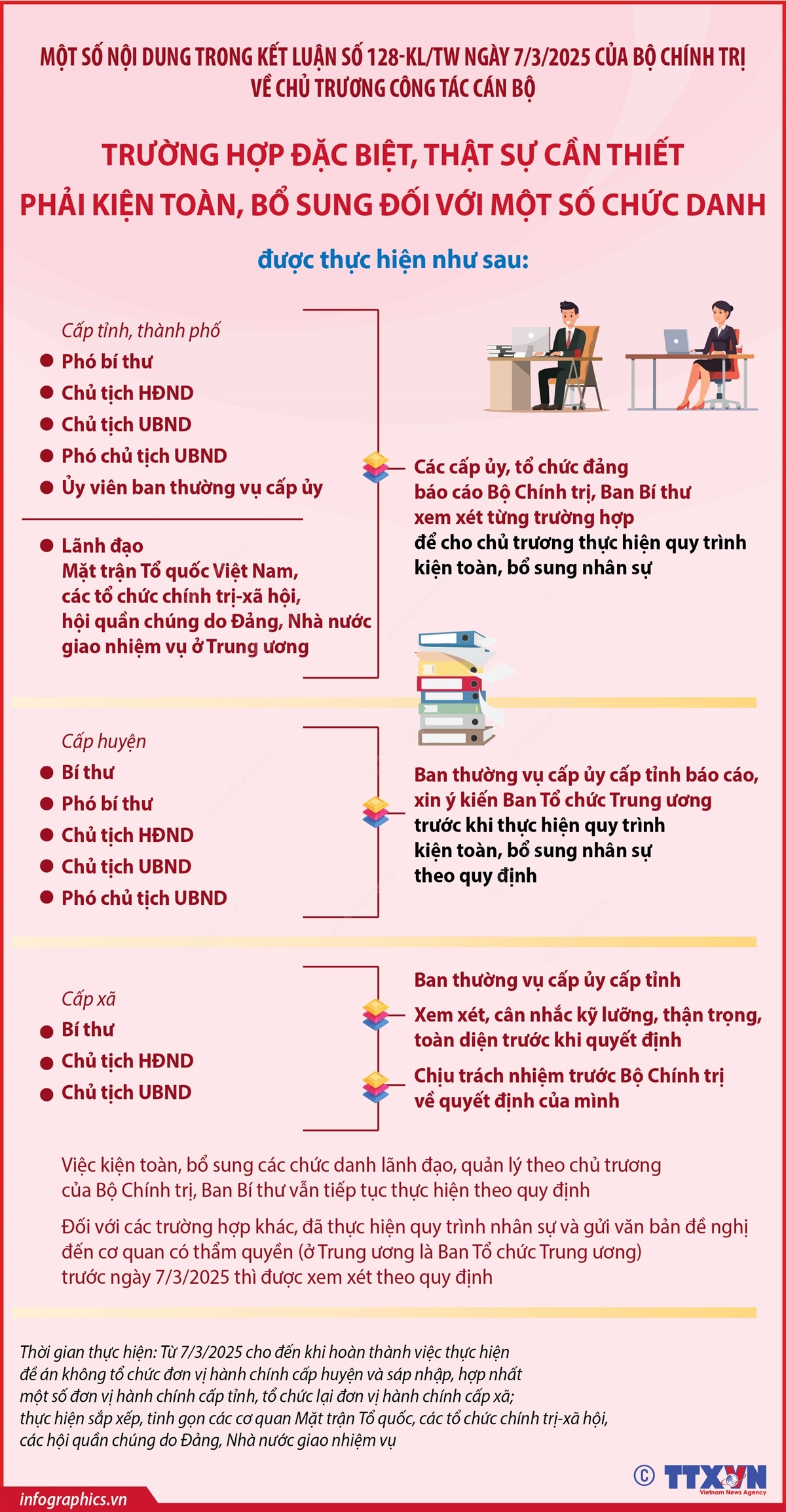 Tại Kết luận số 128-KL/TW ngày 7/3/2025 về chủ trương công tác cán bộ, Bộ Chính trị thống nhất chủ trương về các trường hợp đặc biệt, thật sự cần thiết phải kiện toàn, bổ sung tại cấp tỉnh, cấp huyện, cấp xã.