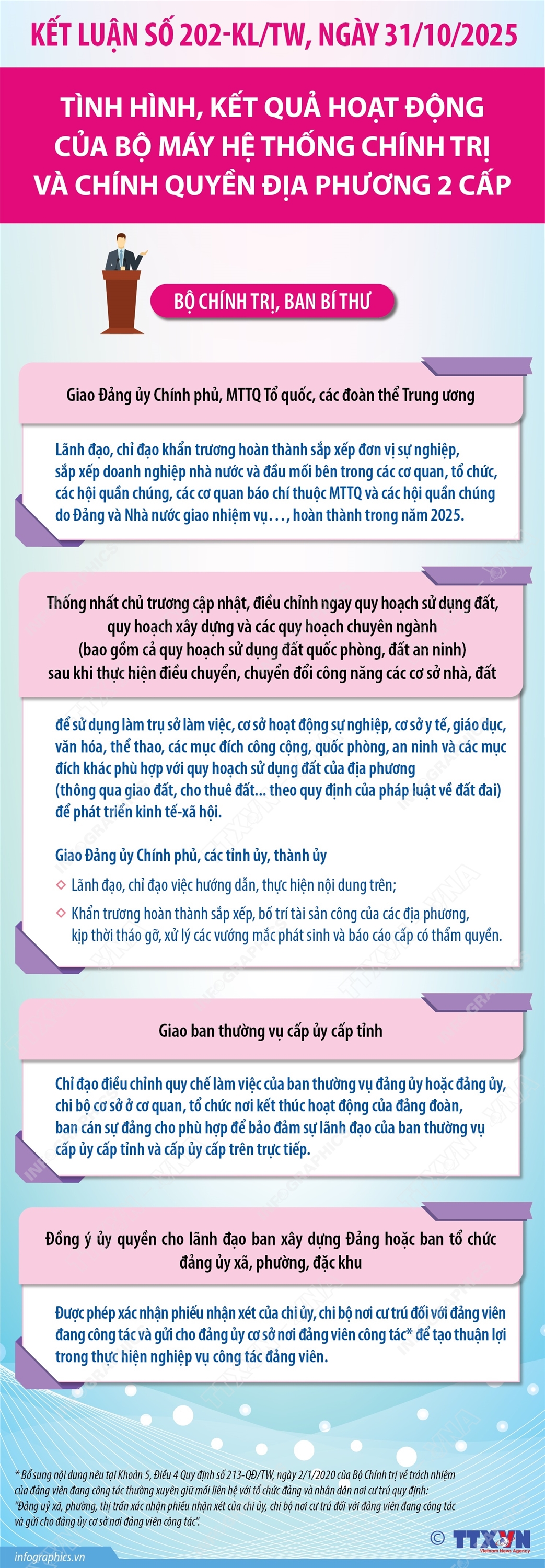 Hà Nội (TTXVN 2/11) Tại Kết luận số 202-KL/TW ngày 31/10/2025 về tình hình, kết quả hoạt động của bộ máy hệ thống chính trị và chính quyền địa phương 2 cấp, Bộ Chính trị, Ban Bí thư thống nhất chủ trương cập nhật, điều chỉnh ngay quy hoạch sử dụng đất, quy hoạch xây dựng và các quy hoạch chuyên ngành (bao gồm cả quy hoạch sử dụng đất quốc phòng, đất an ninh) sau khi thực hiện điều chuyển, chuyển đổi công năng các cơ sở nhà, đất để sử dụng làm trụ sở làm việc, cơ sở hoạt động sự nghiệp, cơ sở y tế, giáo dục, văn hóa, thể thao, các mục đích công cộng, quốc phòng, an ninh và các mục đích khác phù hợp với quy hoạch sử dụng đất của địa phương (thông qua giao đất, cho thuê đất,... theo quy định của pháp luật về đất đai) để phát triển kinh tế - xã hội. Giao Đảng ủy Chính phủ, các tỉnh ủy, thành ủy lãnh đạo, chỉ đạo việc hướng dẫn, thực hiện nội dung trên; khẩn trương hoàn thành sắp xếp, bố trí tài sản công của các địa phương, kịp thời tháo gỡ, xử lý các vướng mắc phát sinh và báo cáo cấp có thẩm quyền. Bộ Chính trị, Ban Bí thư đồng ý giao ban thường vụ cấp ủy cấp tỉnh chỉ đạo điều chỉnh quy chế làm việc của ban thường vụ đảng ủy hoặc đảng ủy, chi bộ cơ sở ở cơ quan, tổ chức nơi kết thúc hoạt động của đảng đoàn, ban cán sự đảng cho phù hợp để bảo đảm sự lãnh đạo của ban thường vụ cấp ủy cấp tỉnh và cấp ủy cấp trên trực tiếp...