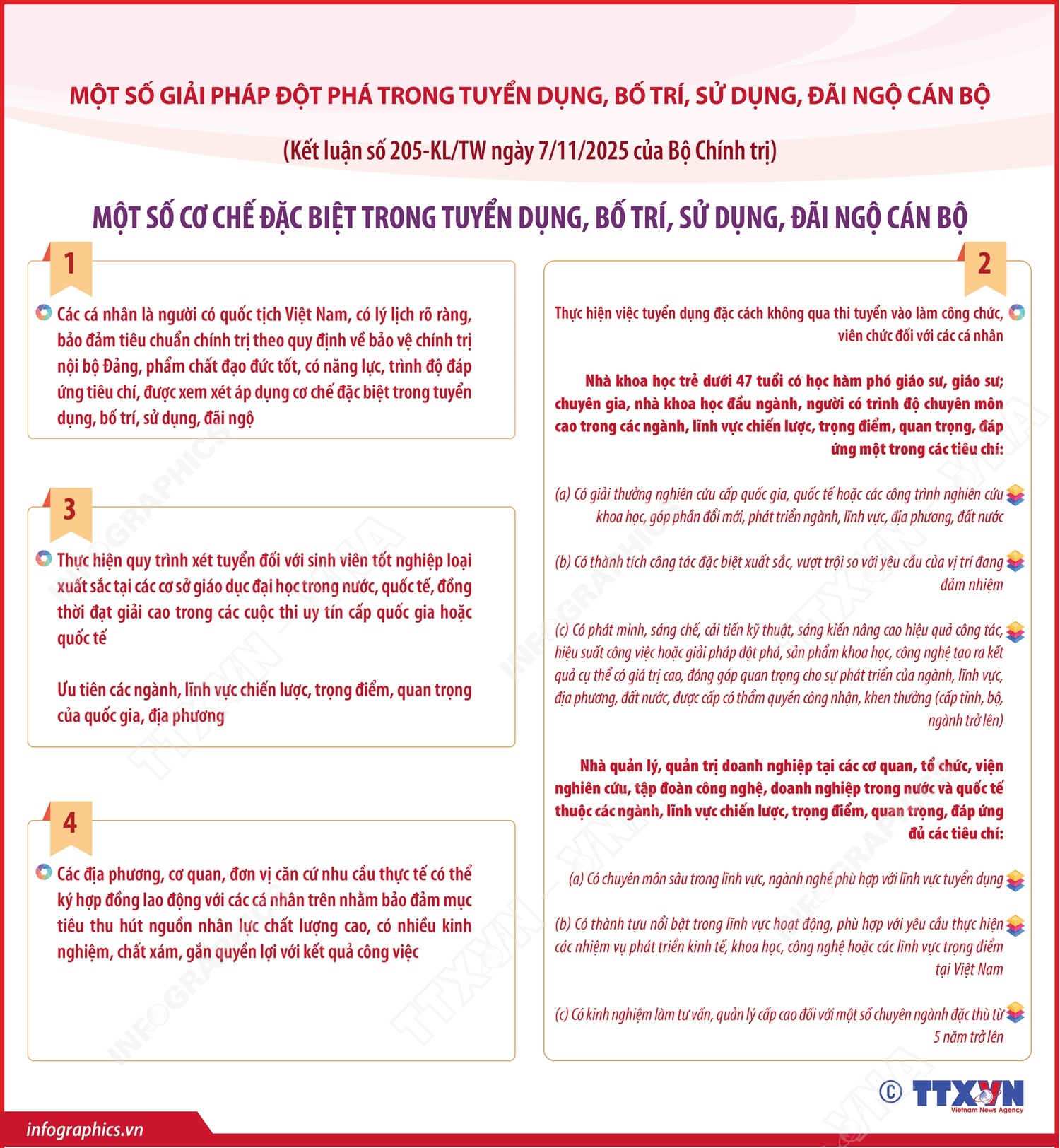 Hà Nội (TTXVN 12/11) Ủy viên Bộ Chính trị, Thường trực Ban Bí thư Trần Cẩm Tú đã ký ban hành Kết luận số 205-KL/TW (ngày 7/11/2025) của Bộ Chính trị về một số giải pháp đột phá trong tuyển dụng, bố trí, sử dụng, đãi ngộ cán bộ. Kết luận số 205 nêu: Xem xét báo cáo của Ban Tổ chức Trung ương về Đề án "Quy định một số cơ chế đặc biệt trong tuyển dụng, bố trí, sử dụng, đãi ngộ cán bộ" và ý kiến của các cơ quan liên quan, Bộ Chính trị kết luận như sau: Để tiếp tục thực hiện thành công đường lối đổi mới; khơi dậy tinh thần yêu nước, ý chí tự cường dân tộc và khát vọng phát triển đất nước hùng cường, thịnh vượng, hạnh phúc, Bộ Chính trị yêu cầu các cấp ủy, tổ chức đảng thực hiện tốt một số giải pháp xây dựng cơ chế, chính sách đột phá, vượt trội nhằm thu hút, tuyển dụng, bố trí, sử dụng, đãi ngộ đối với những cán bộ thực sự tài năng, xuất sắc, đáp ứng yêu cầu phát triển đất nước trong kỷ nguyên mới. Kết luận này có hiệu lực từ thời điểm ban hành và được phổ biến tới chi bộ.