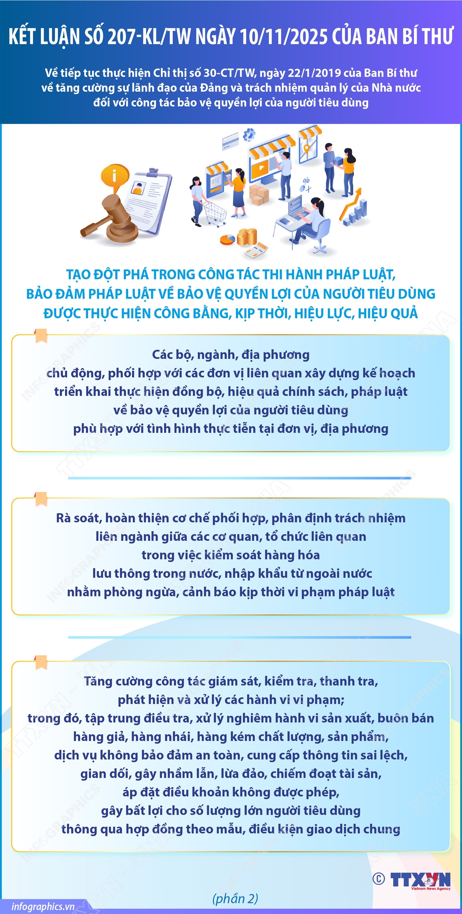 Hà Nội (TTXVN 17/11) Tại Kết luận số 207-KL/TW của Ban Bí thư ngày 10/11/2025 về tiếp tục thực hiện Chỉ thị số 30-CT/TW, ngày 22/1/2019 của Ban Bí thư về tăng cường sự lãnh đạo của Đảng và trách nhiệm quản lý của Nhà nước đối với công tác bảo vệ quyền lợi của người tiêu dùng, Ban Bí thư yêu cầu tạo đột phá trong công tác thi hành pháp luật, bảo đảm pháp luật về bảo vệ quyền lợi của người tiêu dùng được thực hiện công bằng, kịp thời, hiệu lực, hiệu quả.