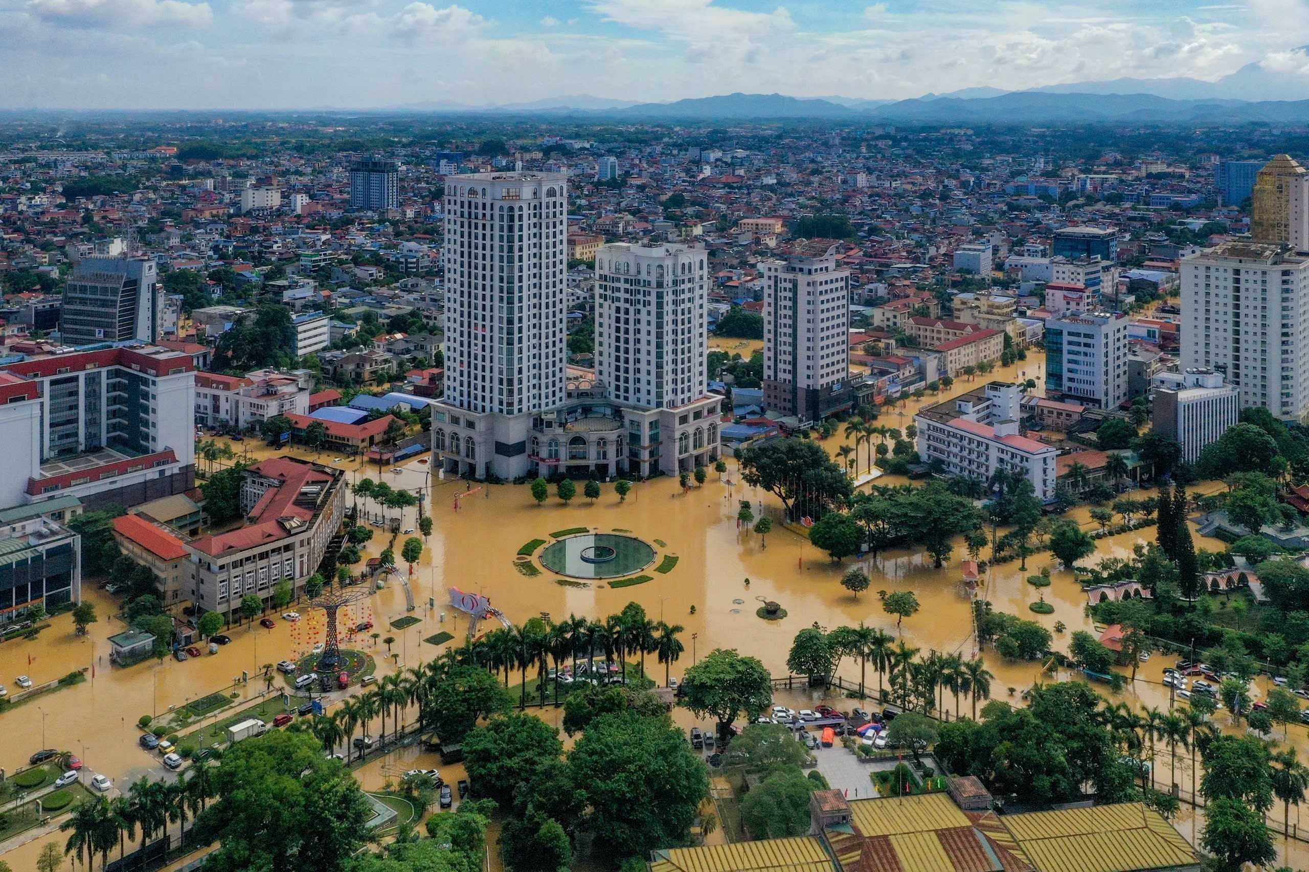 | Khu vực trung tâm tỉnh Thái Nguyên ngập sâu trong nước lũ do ảnh hưởng của hoàn lưu bão số 11, ngày 8/10 |