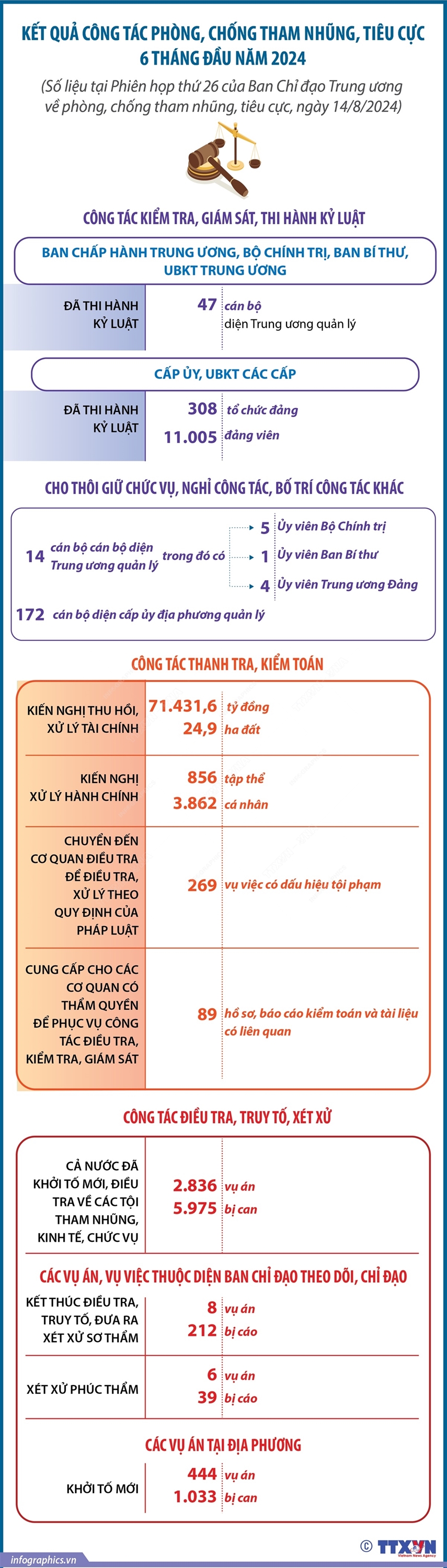 6 tháng đầu năm 2024, công tác phòng, chống tham nhũng, tiêu cực tiếp tục được đẩy mạnh quyết liệt, góp phần quan trọng trong công tác xây dựng, chỉnh đốn Đảng, giữ vững ổn định chính trị, thúc đẩy phát triển kinh tế - xã hội, tăng cường, củng cố thêm niềm tin của nhân dân.