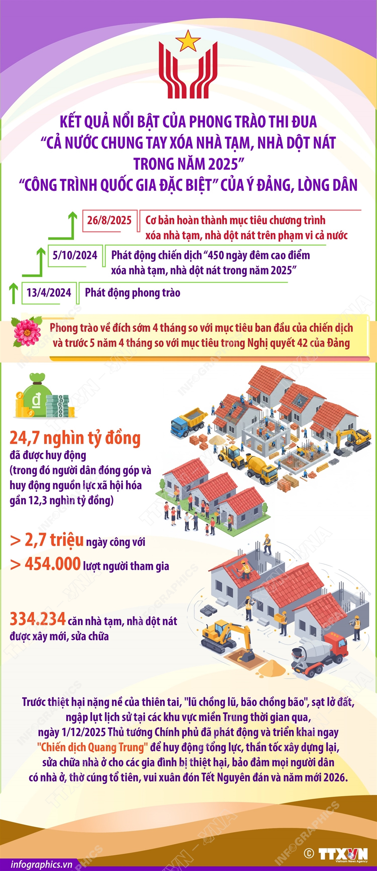 Hà Nội (TTXVN 29/12) Chỉ sau 1 năm 4 tháng phát động phong trào thi đua “Cả nước chung tay xóa nhà tạm, nhà dột nát trong năm 2025” và sau hơn 10 tháng phát động chiến dịch “450 ngày đêm cao điểm xóa nhà tạm, nhà dột nát trong năm 2025”, Ban Chỉ đạo Trung ương, các bộ, ngành, địa phương đã tiến hành một Chiến dịch thần tốc, huy động được trên 24,7 nghìn tỷ đồng (trong đó người dân đóng góp và huy động nguồn lực xã hội hóa chiếm gần một nửa với gần 12,3 nghìn tỷ đồng), hỗ trợ hơn 2,7 triệu ngày công với hơn 454.000 lượt người tham gia, hoàn thành xóa 334.234 căn nhà tạm, nhà dột nát trên cả nước. Đến ngày 26/8/2025 cơ bản hoàn thành mục tiêu chương trình xóa nhà tạm, nhà dột nát trên phạm vi cả nước, một “công trình quốc gia đặc biệt” của “Ý Đảng, lòng dân” đã về đích sớm 4 tháng so với mục tiêu ban đầu của chiến dịch và trước 5 năm 4 tháng so với mục tiêu trong Nghị quyết 42 của Đảng, thiết thực chào mừng 80 năm Cách mạng tháng Tám, Quốc khánh 2/9, chào mừng Đại hội Đảng các cấp, tiến tới Đại hội lần thứ XIV của Đảng.