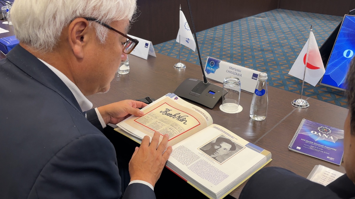 Lãnh đạo các hãng thông tấn OANA chăm chú đọc sách ảnh "100 năm Báo chí Cách mạng Việt Nam" do Nhà xuất bản Thông tấn biên soạn và xuất bản |