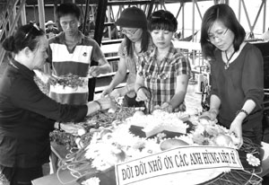 Cán bộ TTXVN (từ phải qua trái: Đ/c Đoàn Tuyết Nhung; Đ/c Lê Huyền) tham gia kết vòng hoa tưởng chuẩn bị cho Lễ thả hoa tưởng niệm các anh hùng, liệt sĩ đã hi sinh bảo vệ chủ quyền đất nước ở vùng biển đảo Gạc Ma - Cô Lin