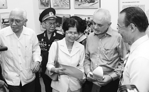 Ông George Burchett (thứ hai bên phải) gặp các nhân chứng lịch sử liên quan đến các sự kiện được thể hiện trong tác phẩm của cha ông. |