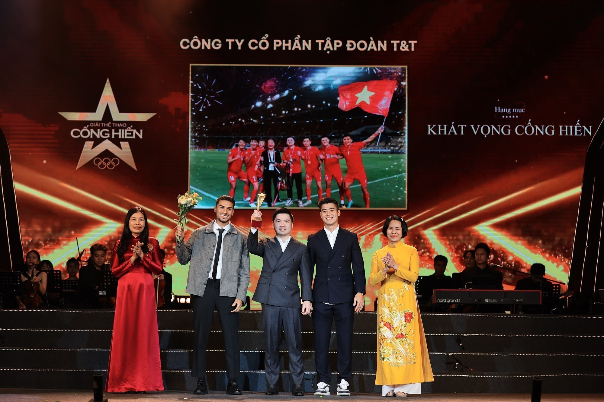 | Phó tổng giám đốc TTXVN Nguyễn Tuấn Hùng trao giải Chiến tích thể thao cho đại diện đội tuyển U22 Việt Nam tại Lễ trao Giải Cống hiến lần thứ 20 - 2026 |