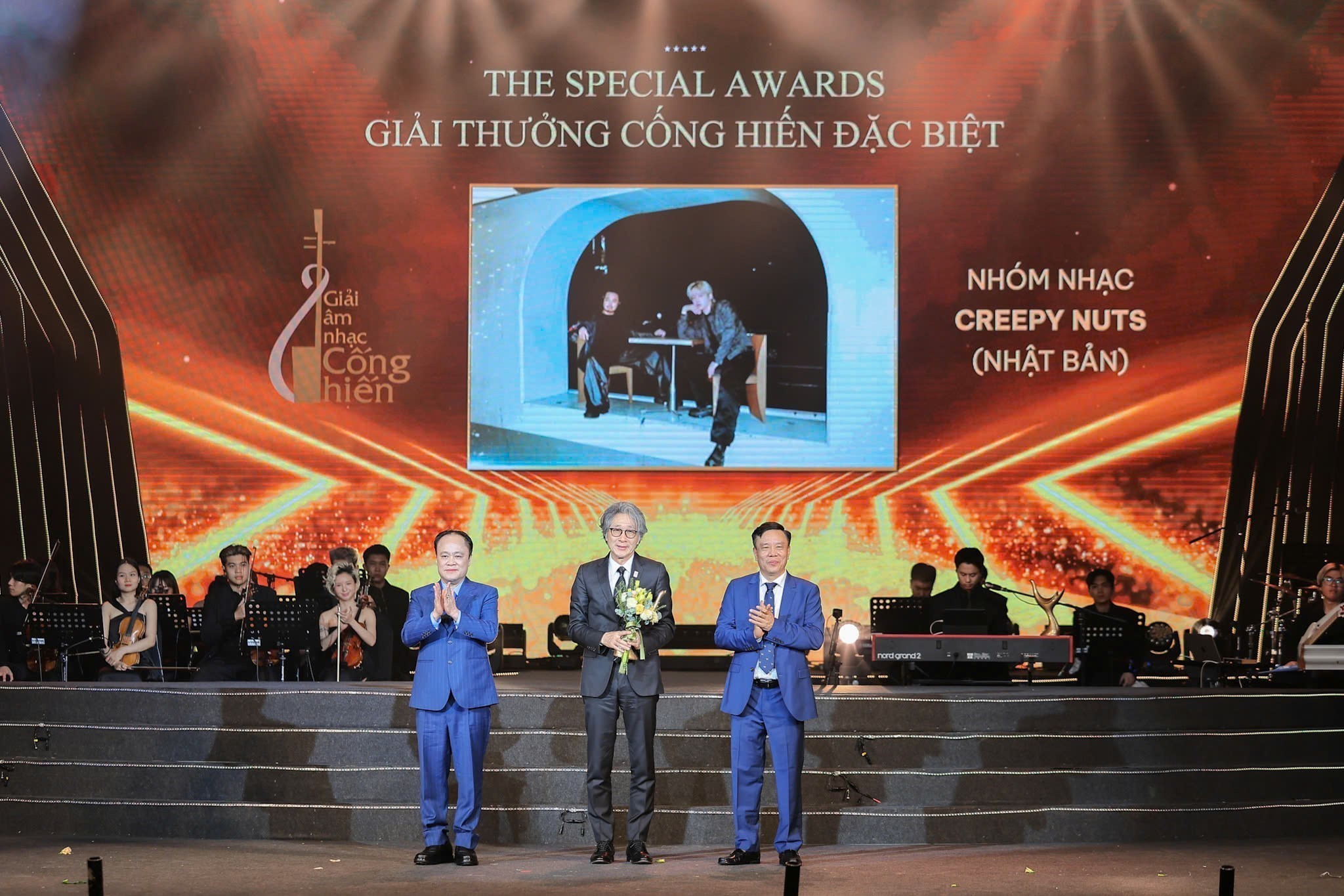 | Tổng biên tập Báo Thể thao và Văn hóa, Trưởng ban tổ chức Giải Cống hiến 2026 Nguyễn Thiện Thuật và Giáo sư, Tiến sĩ danh dự, Nghệ sĩ Chu Bảo Quế trao Giải thưởng Cống hiến Đặc biệt cho đại diện Nhóm nhạc Creepy Nuts của Nhật Bản tại Lễ trao Giải Cống hiến lần thứ 20 - 2026 |