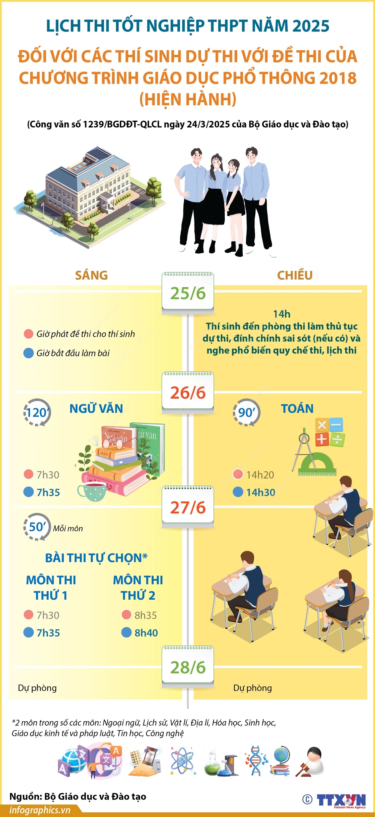 Kỳ thi tốt nghiệp THPT năm 2025 diễn ra trong hai ngày 26 và 27/6/2025, với hai lịch thi dành cho thí sinh học theo Chương trình Giáo dục phổ thông hiện hành 2018 và thí sinh học theo Chương trình Giáo dục phổ thông 2006.