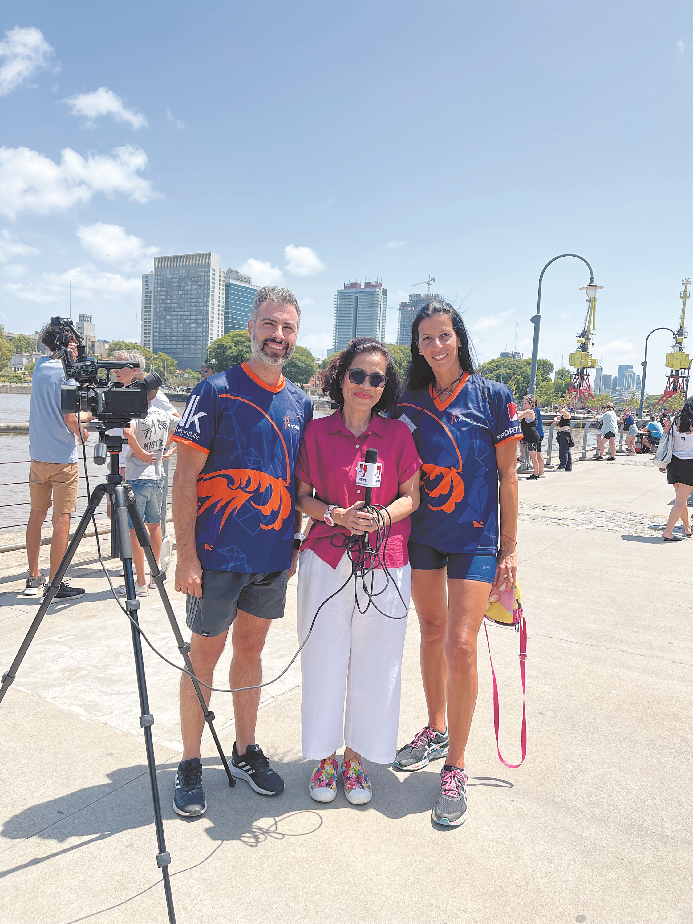 | Nhà báo Diệu Hương phỏng vấn các vận động viên tại lễ hội đua thuyền rồng nhân dịp Tết Nguyên đán |
