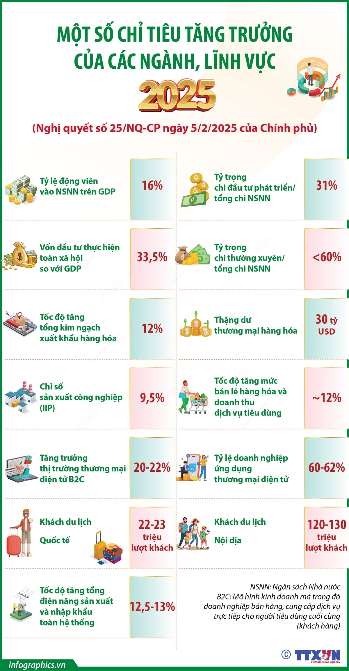 Tại Nghị quyết số 25/NQ-CP ngày 5/2/2025 về mục tiêu tăng trưởng các ngành, lĩnh vực và địa phương bảo đảm mục tiêu tăng trưởng cả nước năm 2025 đạt 8% trở lên, Chính phủ đã giao một số chỉ tiêu tăng trưởng cho các ngành, các lĩnh vực như: tổng kim ngạch xuất nhập khẩu hàng hóa tăng 12%, bán lẻ hàng hóa và doanh thu dịch vụ tiêu dùng tăng 12%, khách du lịch quốc tế đạt 22-23 triệu lượt khách, nội địa đạt 120-130 triệu lượt khách…