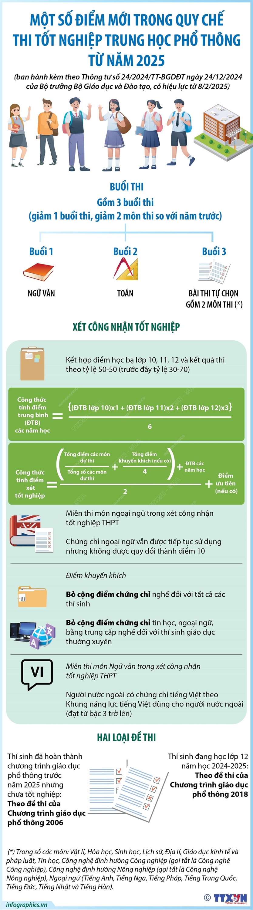 Từ 8/2/2025, Thông tư số 24/2024/TT-BGDĐT ban hành Quy chế thi tốt nghiệp Trung học Phổ thông của Bộ Giáo dục và Đào tạo có hiệu lực thi hành. Quy chế thi tốt nghiệp THPT ban hành kèm theo Thông tư 24/2024/TT-BGDĐT có một số điểm mới đáng chú ý như: Chỉ còn 3 buổi thi tốt nghiệp, giảm 1 buổi thi và 2 môn thi so với năm 2024; chứng chỉ ngoại ngữ vẫn được sử dụng để xét công nhận tốt nghiệp THPT nhưng không được quy đổi thành điểm 10; thí sinh không còn được cộng điểm chứng chỉ nghề; thí sinh người nước ngoài miễn thi ngữ văn bằng chứng chỉ tiếng Việt…