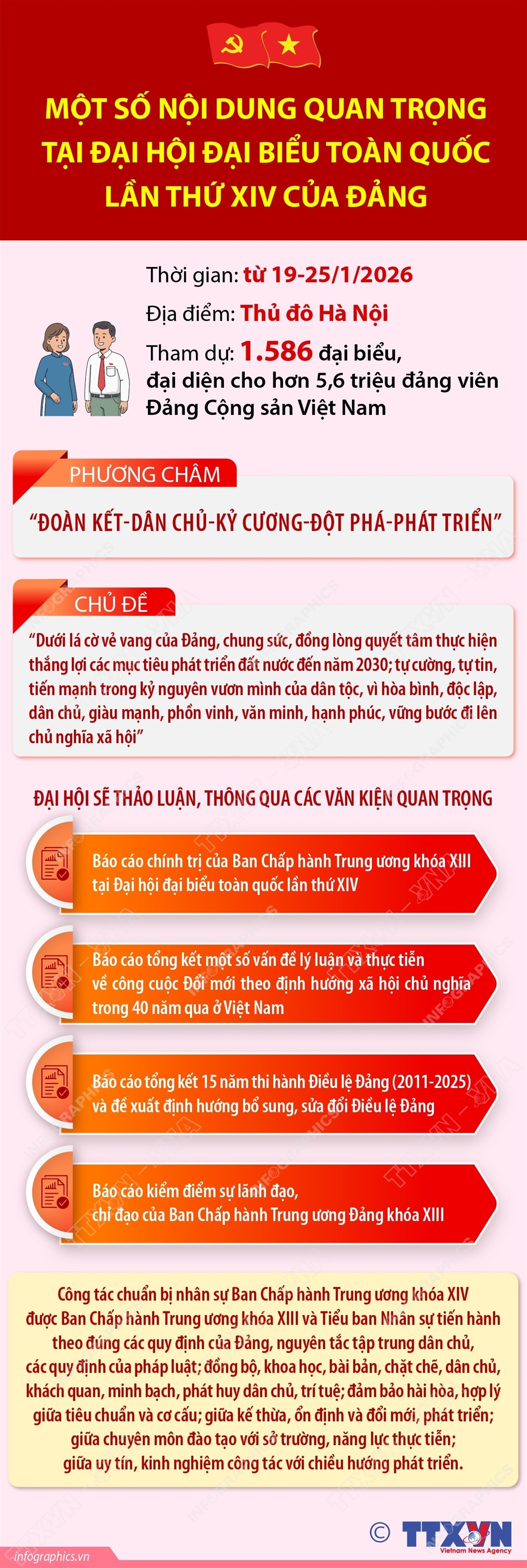 Hà Nội (TTXVN 15/1) Với phương châm “Đoàn kết-Dân chủ-Kỷ cương-Đột phá-Phát triển”, Đại hội đại biểu toàn quốc lần thứ XIV của Đảng sẽ diễn ra tại Thủ đô Hà Nội, từ ngày 19-25/1/2026, với sự tham dự của 1.586 đại biểu, đại diện cho hơn 5,6 triệu đảng viên Đảng Cộng sản Việt Nam. Chủ đề của Đại hội là: “Dưới lá cờ vẻ vang của Đảng, chung sức, đồng lòng quyết tâm thực hiện thắng lợi các mục tiêu phát triển đất nước đến năm 2030; tự cường, tự tin, tiến mạnh trong kỷ nguyên vươn mình của dân tộc, vì hòa bình, độc lập, dân chủ, giàu mạnh, phồn vinh, văn minh, hạnh phúc, vững bước đi lên chủ nghĩa xã hội”.