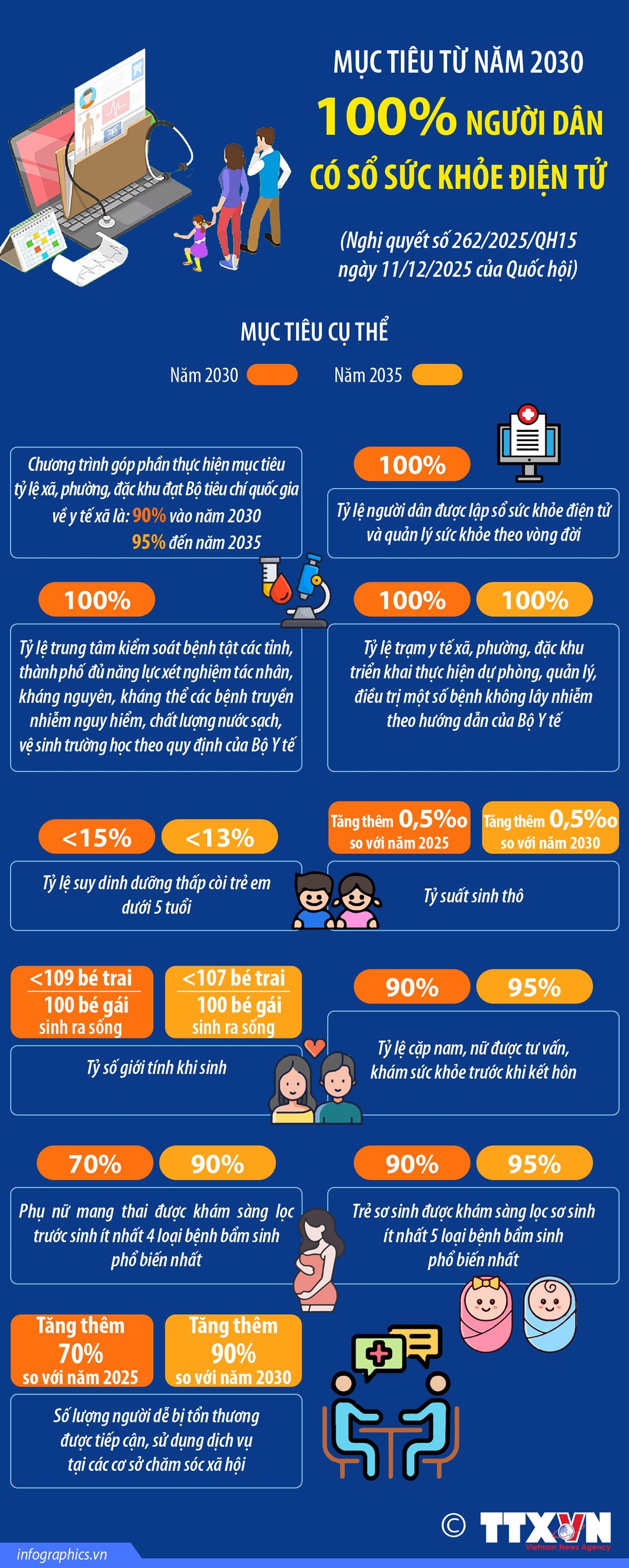 Hà Nội (TTXVN 26/1) Nghị quyết số 262/2025/QH15 ngày 11/12/2025 của Quốc hội phê duyệt chủ trương đầu tư Chương trình mục tiêu quốc gia về chăm sóc sức khỏe, dân số và phát triển giai đoạn 2026-2035. Mục tiêu tổng quát của Chương trình là giai đoạn 2026-2035, Việt Nam bảo đảm mọi người dân đều được quản lý, chăm sóc sức khỏe ban đầu, phòng bệnh từ sớm, từ xa, ngay tại cơ sở, hạn chế bệnh tật; gia tăng tỷ lệ sinh, phấn đấu tỷ số giới tính khi sinh đạt mức cân bằng giới tính khi sinh, thích ứng với già hóa dân số, nâng cao chất lượng dân số; tăng cường chăm sóc cho các nhóm dễ bị tổn thương; góp phần nâng cao sức khỏe thể chất, tinh thần, tầm vóc, tuổi thọ và chất lượng cuộc sống của nhân dân, xây dựng nước Việt Nam khỏe mạnh.