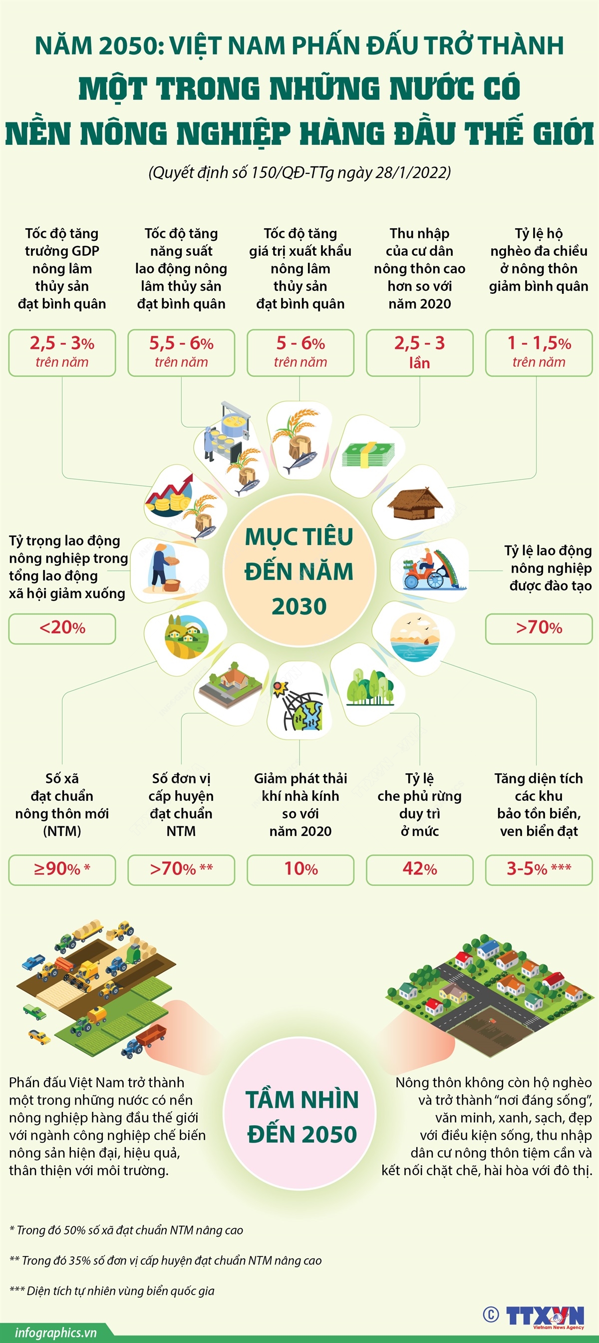 Phó Thủ tướng Lê Văn Thành vừa ký Quyết định số 150/QĐ-TTg phê duyệt Chiến lược phát triển nông nghiệp và nông thôn bền vững giai đoạn 2021-2030, tầm nhìn đến năm 2050. Theo đó mục tiêu đến năm 2030, tốc độ tăng trưởng GDP nông lâm thủy sản đạt bình quân từ 2,5-3%/năm, tầm nhìn đến năm 2050, Việt Nam trở thành một trong những nước có nền nông nghiệp hàng đầu thế giới với ngành công nghiệp chế biến nông sản hiện đại, hiệu quả, thân thiện với môi trường…
