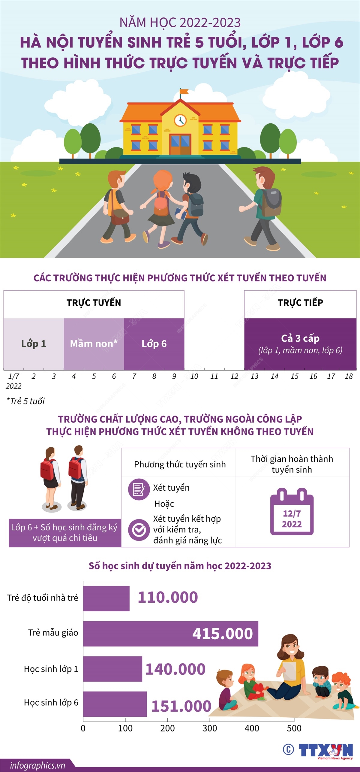 Năm học 2022-2023, công tác tuyển sinh vào các trường mầm non, lớp 1, lớp 6 ở Hà Nội tiếp tục được giữ ổn định như năm học trước. Theo đó, các trường thực hiện phương thức xét tuyển theo tuyến tuyển sinh do UBND quận, huyện, thị xã quy định, đồng thời tiếp tục sử dụng phần mềm hỗ trợ tuyển sinh trực tuyến trên toàn thành phố.