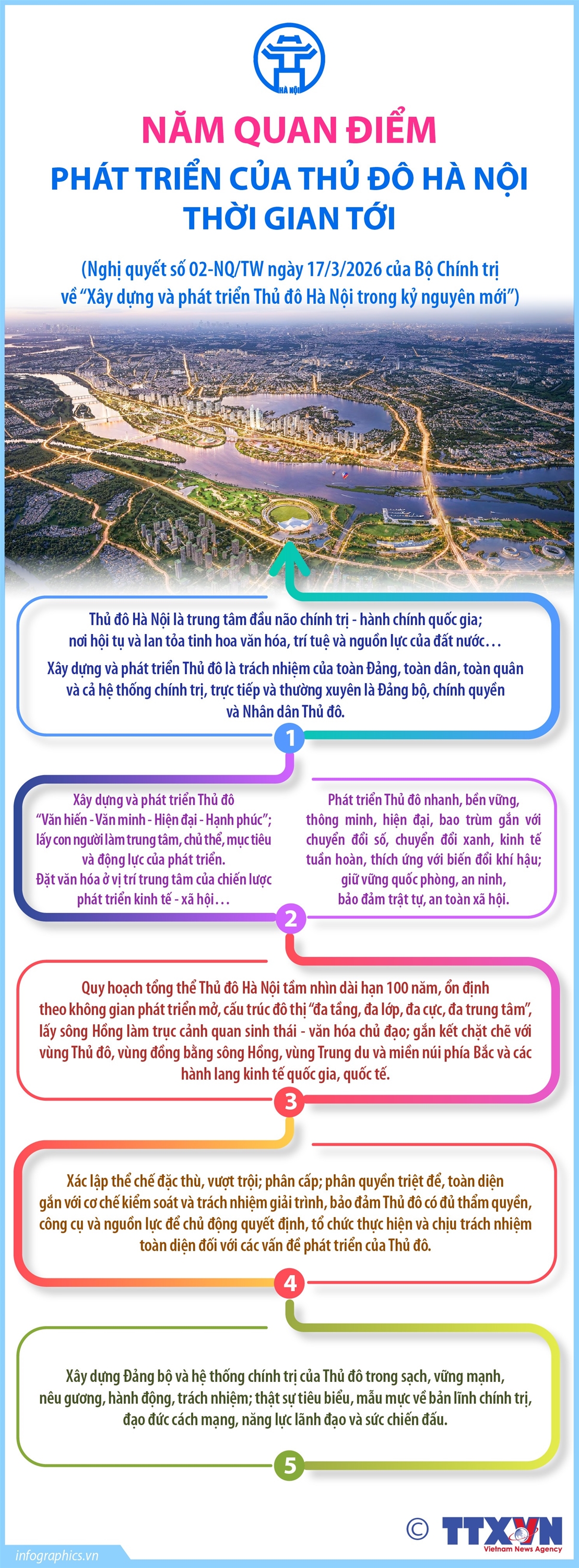 Hà Nội (TTXVN 25/3) Ngày 17/3/2026, Tổng Bí thư Tô Lâm ký ban hành Nghị quyết số 02-NQ/TW của Bộ Chính trị về “Xây dựng và phát triển Thủ đô Hà Nội trong kỷ nguyên mới”. Trên cơ sở đánh giá tình hình thực tiễn tại Thủ đô Hà Nội những năm qua, Nghị quyết đề ra 5 quan điểm phát triển của Thủ đô thời gian tới. Thứ nhất, Nghị quyết thống nhất nhận thức về vị trí, vai trò và tầm quan trọng đặc biệt của Thủ đô Hà Nội là trung tâm đầu não chính trị - hành chính quốc gia… Xây dựng và phát triển Thủ đô là trách nhiệm của toàn Đảng, toàn dân, toàn quân và cả hệ thống chính trị, trực tiếp và thường xuyên là Đảng bộ, chính quyền và Nhân dân Thủ đô. Thứ hai, xây dựng và phát triển Thủ đô “Văn hiến - Văn minh - Hiện đại - Hạnh phúc”; lấy con người làm trung tâm, chủ thể, mục tiêu và động lực của phát triển. Phát triển Thủ đô nhanh, bền vững, thông minh, hiện đại, bao trùm gắn với chuyển đổi số, chuyển đổi xanh, kinh tế tuần hoàn, thích ứng với biến đổi khí hậu; giữ vững quốc phòng, an ninh, bảo đảm trật tự, an toàn xã hội…