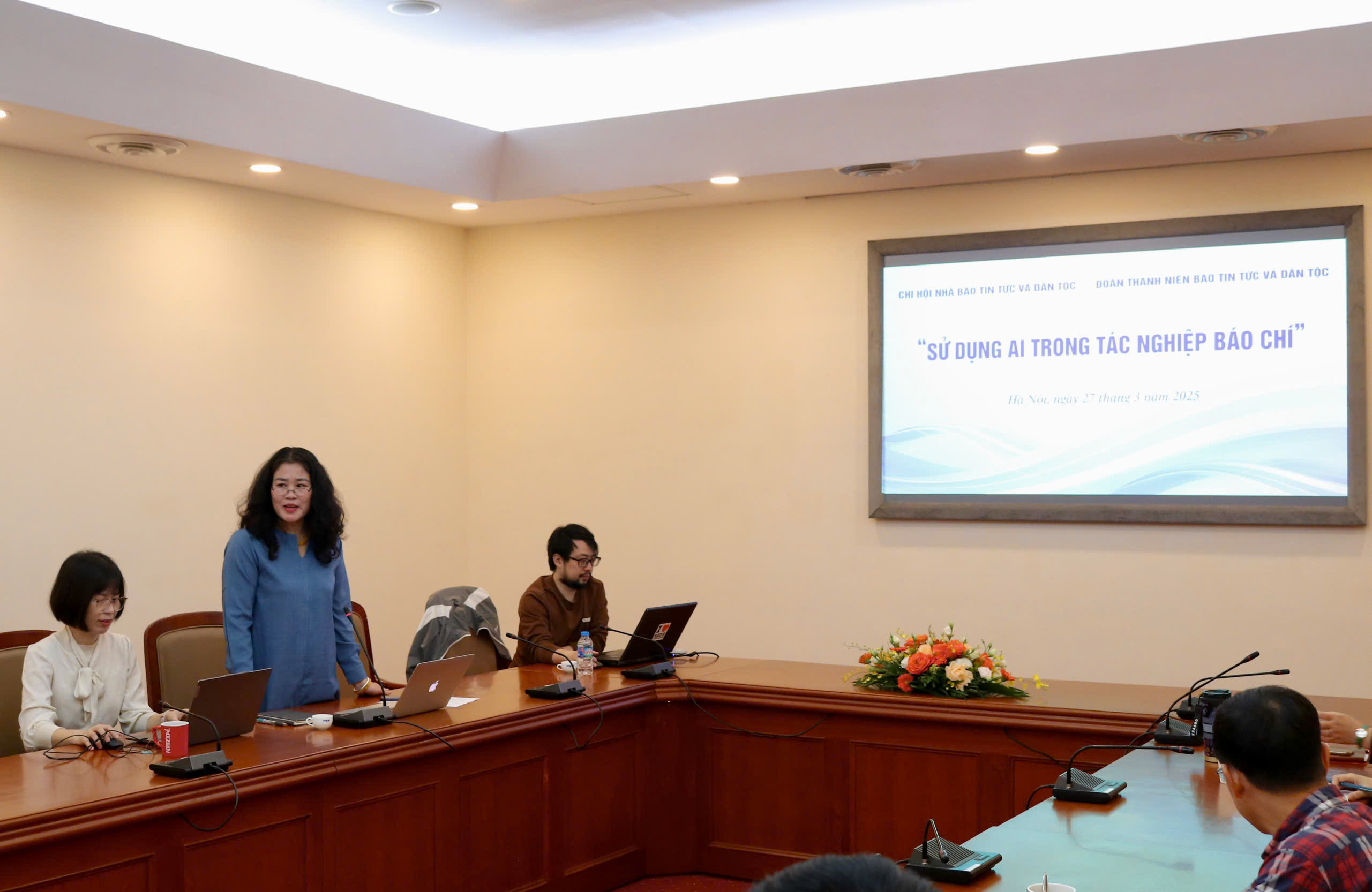 | Phó tổng biên tập báo Tin tức Phạm Thùy Hương phát biểu tại buổi trao đổi nghiệp vụ với chủ đề “Sử dụng AI trong tác nghiệp báo chí”, ngày 27/3 |