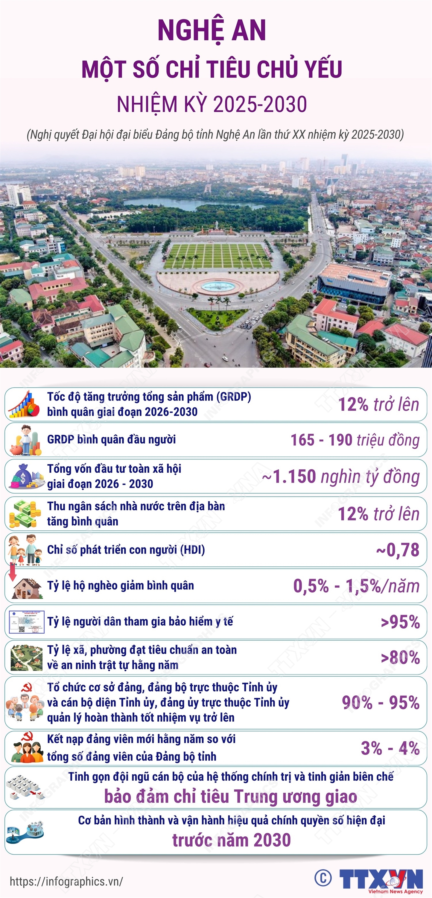 Hà Nội (TTXVN 22/10) Đại hội Đại biểu Đảng bộ tỉnh Nghệ An lần thứ XX, nhiệm kỳ 2025-2030 được tổ chức từ ngày 1 - 3/10/2025 đã thông qua Nghị quyết Đại hội, nhất trí định hướng phát triển và nhiệm vụ, giải pháp nhiệm kỳ 2025-2030 với mục tiêu tổng quát là: Phấn đấu đến năm 2030, Nghệ An trở thành tỉnh khá của cả nước, cực tăng trưởng tầm quốc gia; là trung tâm của khu vực Bắc Trung Bộ về công nghiệp và nông nghiệp ứng dụng công nghệ cao, y tế, giáo dục và đào tạo, khoa học và công nghệ, thương mại, logistics, du lịch; có hệ thống kết cấu hạ tầng đồng bộ, hiện đại, thích ứng hiệu quả với biến đổi khí hậu; đời sống vật chất, tinh thần và sức khỏe Nhân dân không ngừng được nâng cao; giá trị hệ sinh thái rừng, biển, đảo, văn hóa, lịch sử và truyền thống, nhất là văn hóa xứ Nghệ được bảo tồn và phát huy; quốc phòng, an ninh và chủ quyền biên giới, biển, đảo được giữ vững. Tầm nhìn đến năm 2045, Nghệ An trở thành tỉnh có thu nhập cao, phát triển toàn diện, văn minh, hiện đại.
