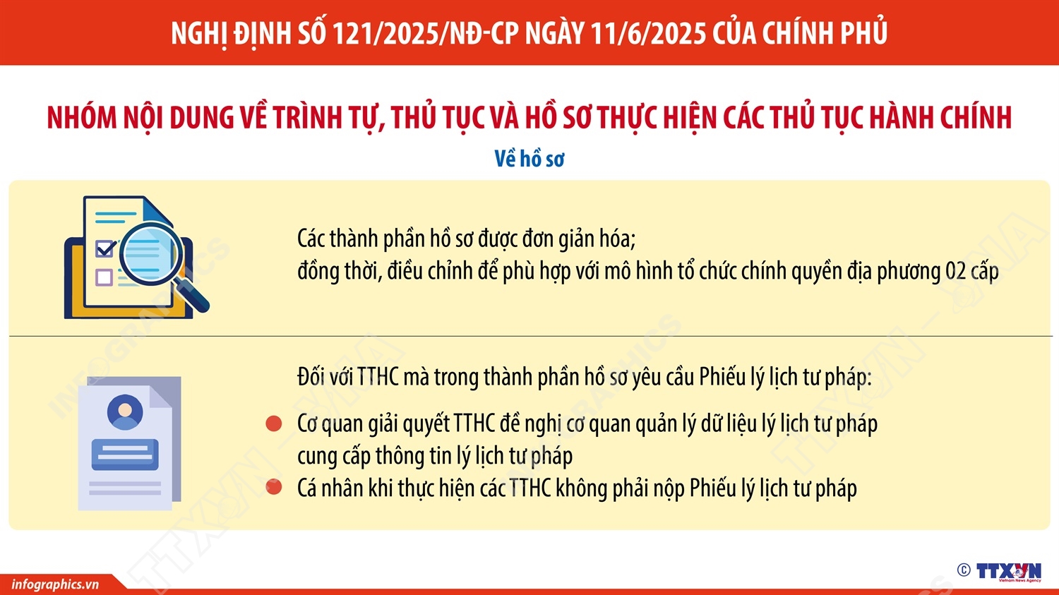Hà Nội (TTXVN 29/6) Theo Nghị định số 121/2025/NĐ-CP ngày 11/6/2025 quy định về phân định thẩm quyền của chính quyền địa phương 2 cấp trong lĩnh vực quản lý nhà nước của Bộ Tư pháp, từ 1/7/2025, việc thực hiện thủ tục hành chính theo hướng “phi địa giới hành chính”, tức là người dân có quyền đến bất cứ UBND cấp xã nào để yêu cầu được giải quyết các thủ tục hành chính mà không phụ thuộc vào nơi cư trú…. Các thành phần hồ sơ giải quyết thủ tục hành chính được rà soát và quy định theo hướng thực thi các phương án đơn giản hóa thủ tục hành chính; đồng thời, điều chỉnh để phù hợp với mô hình tổ chức chính quyền địa phương 2 cấp.