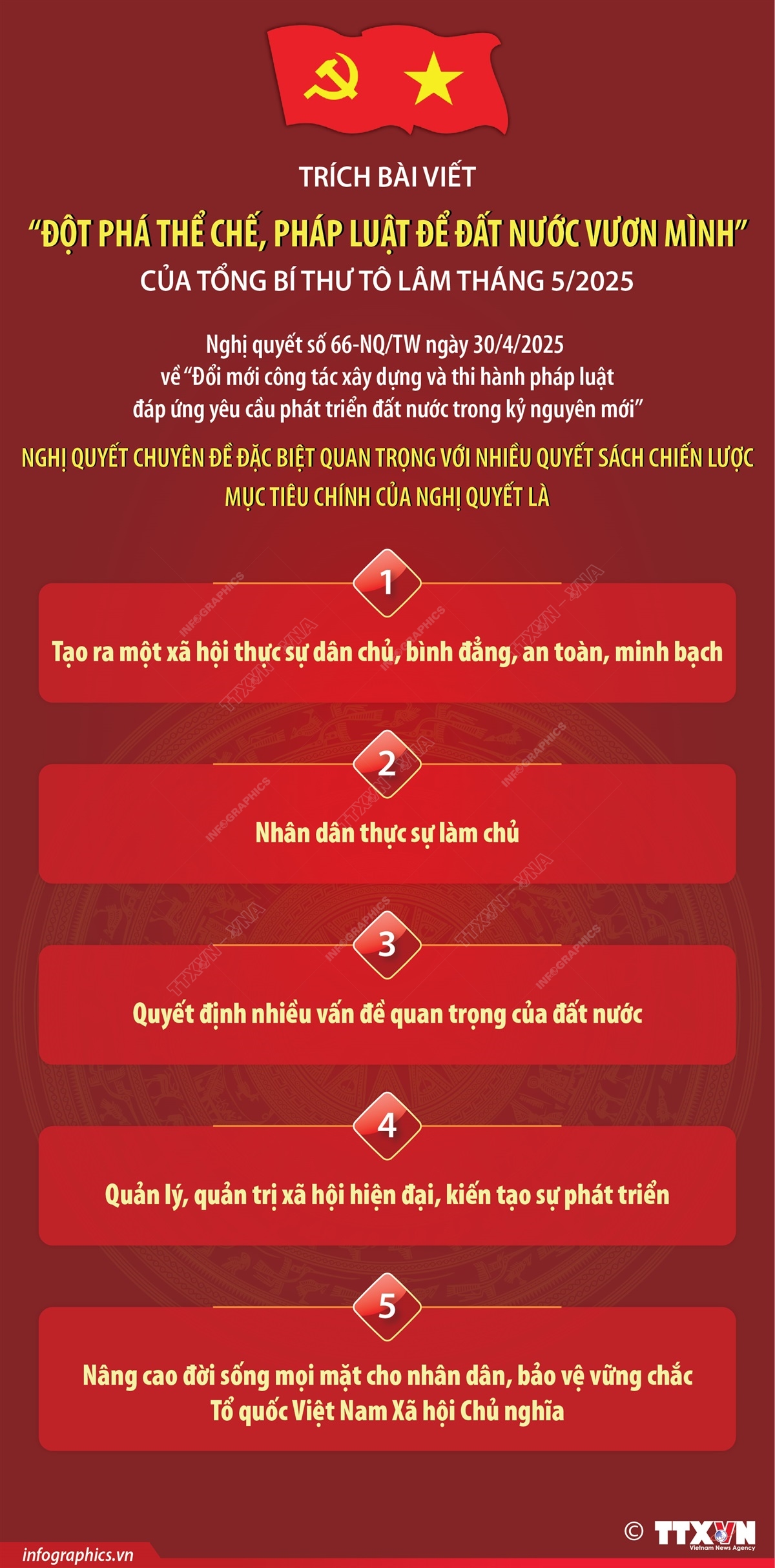 Hà Nội (TTXVN 4/5) Ngày 4/5/2025, Tổng Bí thư Tô Lâm viết bài “Đột phá thể chế, pháp luật để đất nước vươn mình”. Trong bài viết, Tổng Bí thư nhấn mạnh: Bộ Chính trị đã ban hành Nghị quyết số 66-NQ/TW ngày 30/4/2025 về “Đổi mới công tác xây dựng và thi hành pháp luật đáp ứng yêu cầu phát triển đất nước trong kỷ nguyên mới” - một Nghị quyết chuyên đề đặc biệt quan trọng với nhiều quyết sách chiến lược. Mục tiêu chính của Nghị quyết là tạo ra một xã hội thực sự dân chủ, bình đẳng, an toàn, minh bạch; nhân dân thực sự làm chủ; quyết định nhiều vấn đề quan trọng của đất nước; quản lý, quản trị xã hội hiện đại, kiến tạo sự phát triển; nâng cao đời sống mọi mặt cho nhân dân, bảo vệ vững chắc Tổ quốc Việt Nam Xã hội Chủ nghĩa.