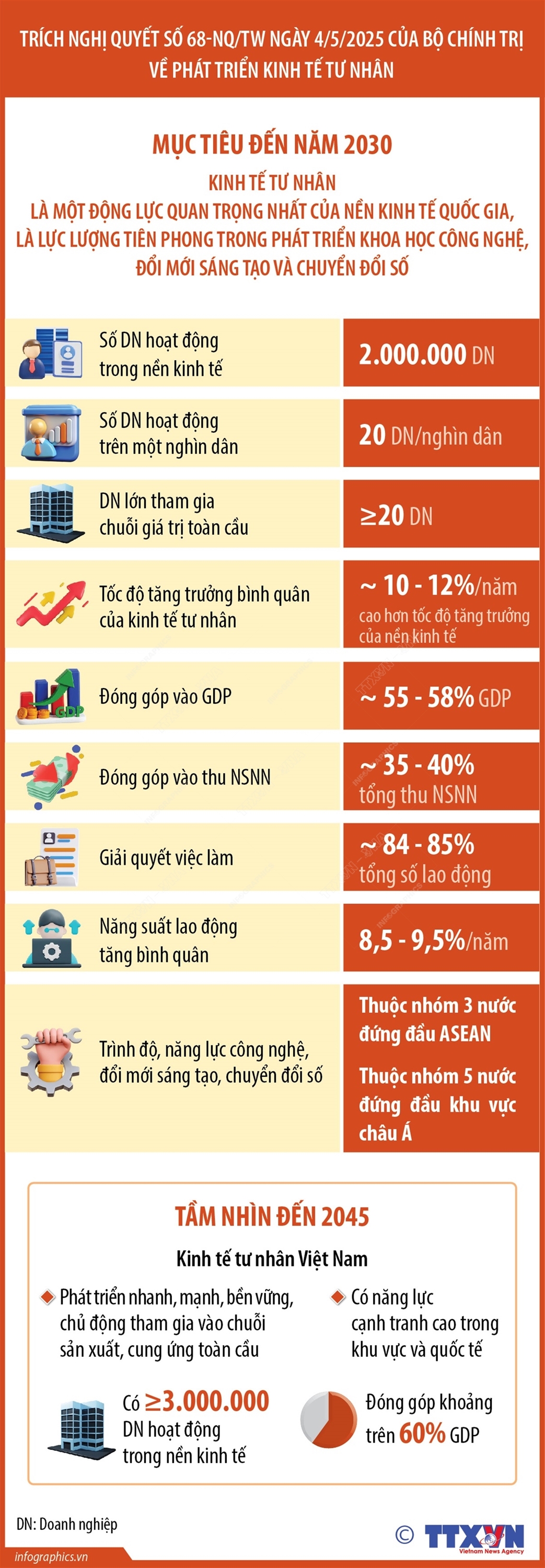 Hà Nội (TTXVN 6/5) Thay mặt Bộ Chính trị, Tổng Bí thư Tô Lâm vừa ký Nghị quyết số 68-NQ/TW ngày 4/5/2025 của Bộ Chính trị về phát triển kinh tế tư nhân. Nghị quyết đề ra mục tiêu đến năm 2030, kinh tế tư nhân là một động lực quan trọng nhất của nền kinh tế quốc gia; là lực lượng tiên phong trong phát triển khoa học công nghệ, đổi mới sáng tạo và chuyển đổi số... Tầm nhìn đến 2045, kinh tế tư nhân Việt Nam phát triển nhanh, mạnh, bền vững, chủ động tham gia vào chuỗi sản xuất, cung ứng toàn cầu; có năng lực cạnh tranh cao trong khu vực và quốc tế; phấn đấu đến năm 2045 có ít nhất 3 triệu doanh nghiệp hoạt động trong nền kinh tế; đóng góp khoảng trên 60% GDP.