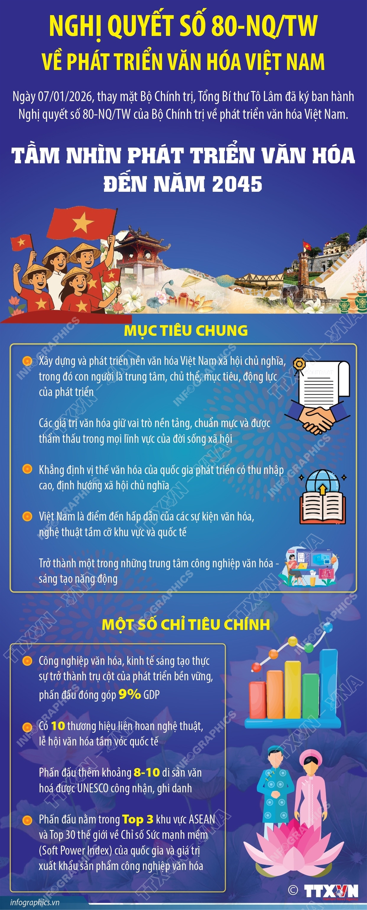 Hà Nội (TTXVN 15/1) Ngày 7/1/2026, thay mặt Bộ Chính trị, Tổng Bí thư Tô Lâm đã ký ban hành Nghị quyết số 80-NQ/TW của Bộ Chính trị về phát triển văn hóa Việt Nam. Nghị quyết được ban hành trong bối cảnh đất nước bước vào giai đoạn phát triển mới với yêu cầu ngày càng cao về phát triển nhanh, bền vững, gắn kết chặt chẽ giữa kinh tế, chính trị, xã hội với văn hóa và con người. Nghị quyết đề ra tầm nhìn đến năm 2045: Xây dựng và phát triển nền văn hóa Việt Nam xã hội chủ nghĩa, trong đó con người là trung tâm, chủ thể, mục tiêu, động lực của phát triển; các giá trị văn hóa giữ vai trò nền tảng, chuẩn mực và được thẩm thấu trong mọi lĩnh vực của đời sống xã hội. Khẳng định vị thế văn hóa của quốc gia phát triển có thu nhập cao, định hướng xã hội chủ nghĩa. Việt Nam là điểm đến hấp dẫn của các sự kiện văn hóa, nghệ thuật tầm cỡ khu vực và quốc tế; trở thành một trong những trung tâm công nghiệp văn hóa - sáng tạo năng động.