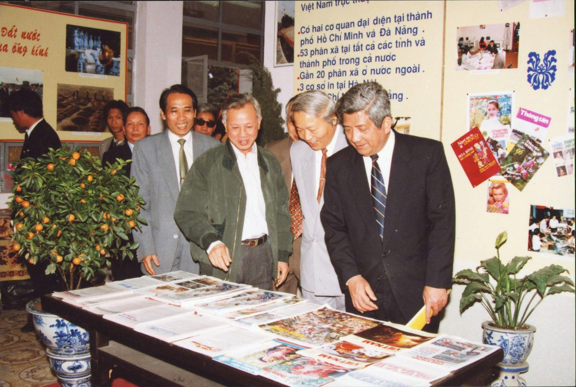 Nhà báo Nguyễn Duy Cương, Trưởng ban Thư ký biên tập và Quan hệ quốc tế, Phó Chủ tịch Liên chi hội Nhà báo TTXVN giới thiệu với đồng chí Phạm Thế Duyệt, Ủy viên Bộ Chính trị, Bí thư Thành ủy Hà Nội, các ấn phẩm của TTXVN tại Hội Báo Xuân 1996 |