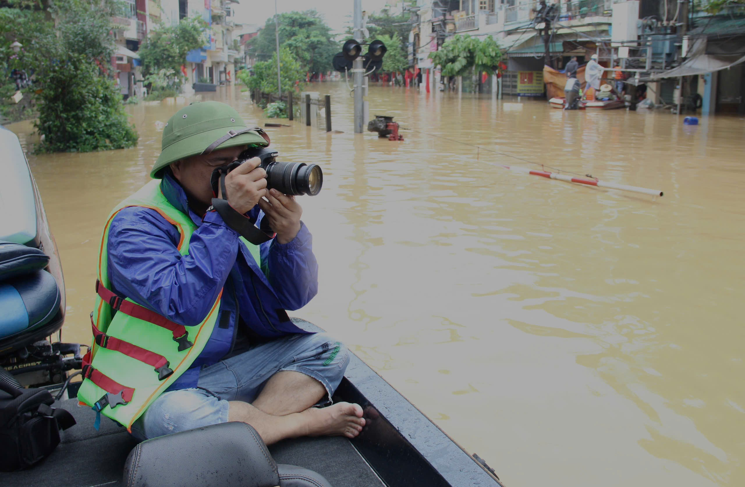 | Phó trưởng CQTT tại Lào Cai Đỗ Tuấn Anh tác nghiệp tại khu vực ngập lụt do ảnh hưởng của cơn bão số 10, phường Yên Bái, tỉnh Lào Cai, tháng 9/2025 |