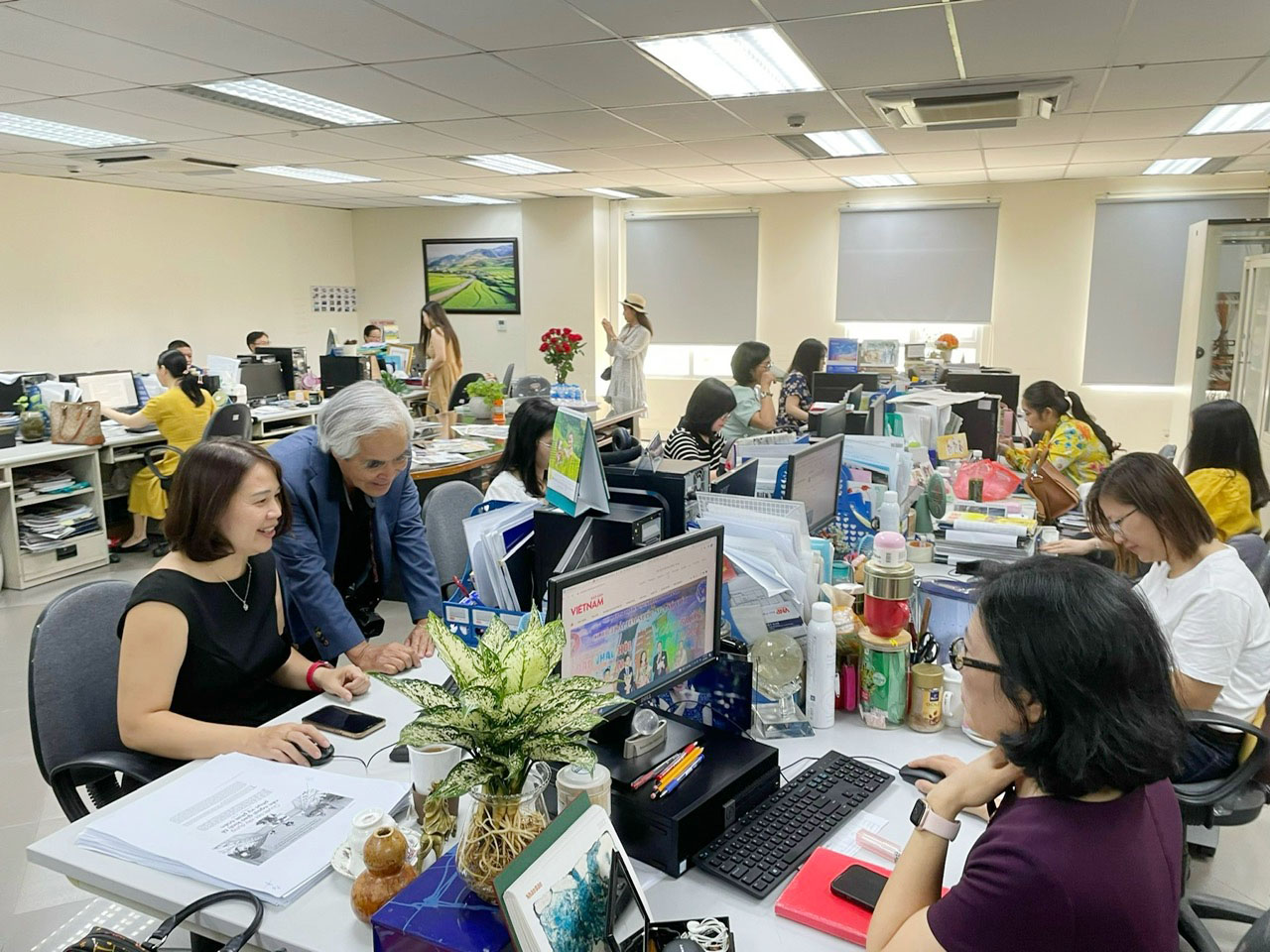Ở Báo ảnh Việt Nam, phòng Tòa soạn và phòng Phóng viên được coi là hai đơn vị xương sống, quyết định sự sống còn của tờ báo, bởi đây chính là nơi cho ra đời những sản phẩm “đối ngoại” hấp dẫn, chất lượng. Đằng sau mỗi bức ảnh, mỗi bài viết là tâm huyết, sáng tạo của đội ngũ phóng viên, biên tập viên. Nếu như anh em phòng Phóng viên phải trăn trở để tìm ra những đề tài hấp dẫn, phải xông xáo, lăn lộn tại hiện trường để thực hiện thật tốt các đề tài, thì các biên tập viên ngữ cũng có một nhiệm vụ không kém phần quan trọng, đó là biến những câu chuyện đó thành những tác phẩm đa ngôn ngữ. Để làm được điều này, các biên tập viên không chỉ đảm bảo thông điệp được truyền tải chính xác và hiệu quả, mà còn phải lựa chọn từ ngữ, văn phong, hình ảnh sao cho phù hợp, hấp dẫn với từng đối tượng bạn đọc nước ngoài, bởi mỗi dân tộc có nền văn hóa riêng và có cách tiếp nhận thông tin khác nhau.