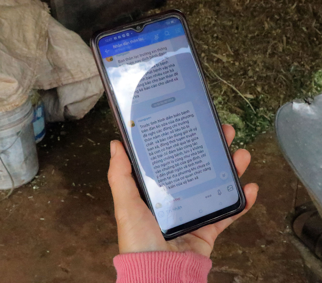 Đúng như thông tin bà con báo lên, địa phương này có số lượng lớn bò sữa nhiễm bệnh từ nhiều ngày qua, nhưng chính quyền địa phương cấm người dân thông tin ra ngoài. Một chủ trại bò đưa cho chúng tôi xem tin nhắn trên điện thoại, nội dung lãnh đạo xã chỉ đạo các trưởng thôn theo dõi, báo cáo tình hình đàn bò. Trong đó có câu: “… lưu ý không cho người lạ cũng như nhà báo vào chuồng bò của gia đình…”. Trong khi ba nhà báo (TTXVN, Công an Nhân dân, Pháp luật Việt Nam) có mặt, chứng kiến những con bò sữa nặng tới gần một tấn đã chết, được chở đi tiêu hủy. Nhiều gia đình phải đào hố, chôn bò chết ngay trong vườn nhà. Tất cả các chủ trại bò đều khẳng định, chỉ có bò tiêm vaccine mới bị bệnh, nhưng ngành chức năng và chính quyền địa phương không thừa nhận, cũng không cử cán bộ thú y tới hướng dẫn điều trị.