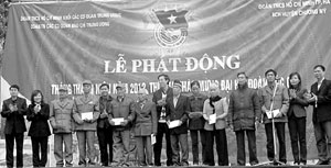 Tặng quà cho các gia đình chính sách tại Lễ phát động Tháng Thanh niên 2012 của Đoàn khối cơ quan TƯ tại Chùa Trầm, xã Phụng Chân, Chương Mỹ, Hà Nội. |