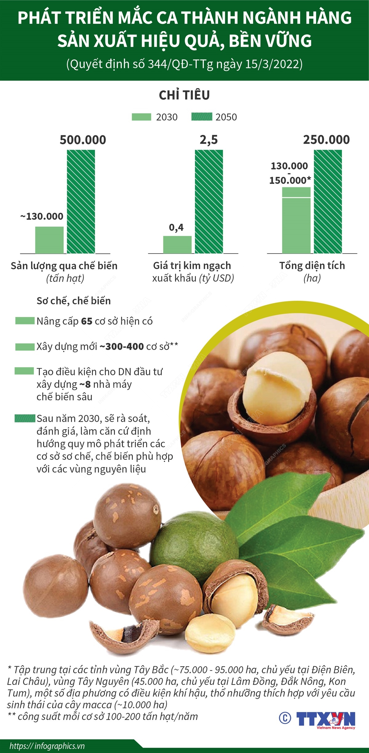 Việt Nam đặt mục tiêu phát triển Mắc ca thành ngành hàng sản xuất hiệu quả, bền vững, góp phần thực hiện Chiến lược phát triển nông nghiệp và nông thôn bền vững giai đoạn 2021-2030, tầm nhìn đến năm 2050, phát triển kinh tế-xã hội, bảo vệ môi trường và đảm bảo quốc phòng, an ninh của đất nước.