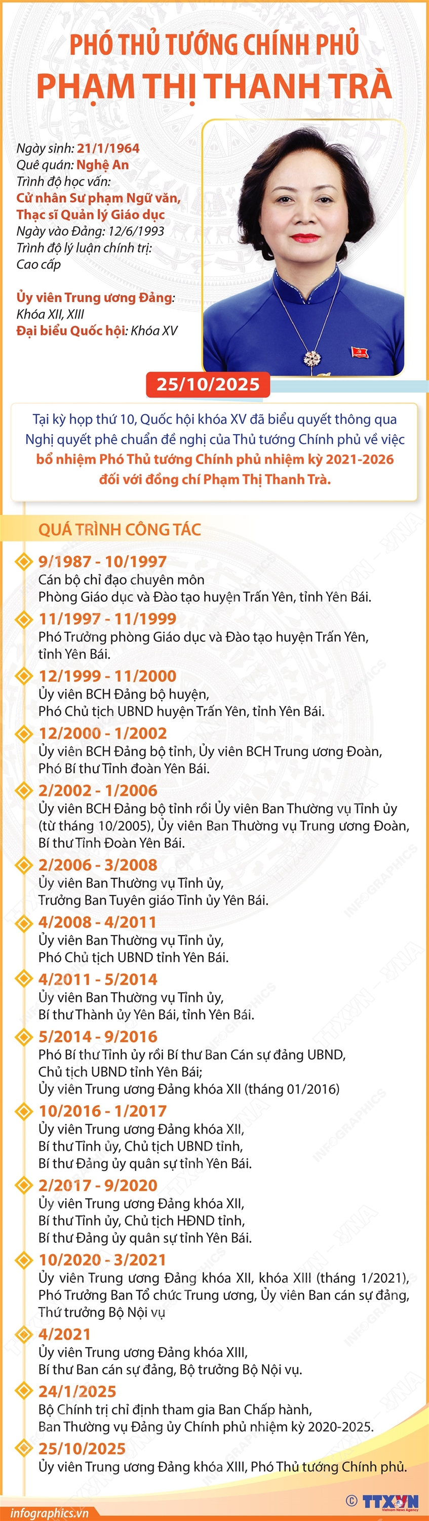 Hà Nội (TTXVN 25/10) Ngày 25/10/2025, Kỳ họp lần thứ 10 Quốc hội khóa XV thông qua Nghị quyết phê chuẩn đề nghị của Thủ tướng Chính phủ về việc bổ nhiệm Phó Thủ tướng Chính phủ nhiệm kỳ 2021-2026 đối với đồng chí Phạm Thị Thanh Trà.