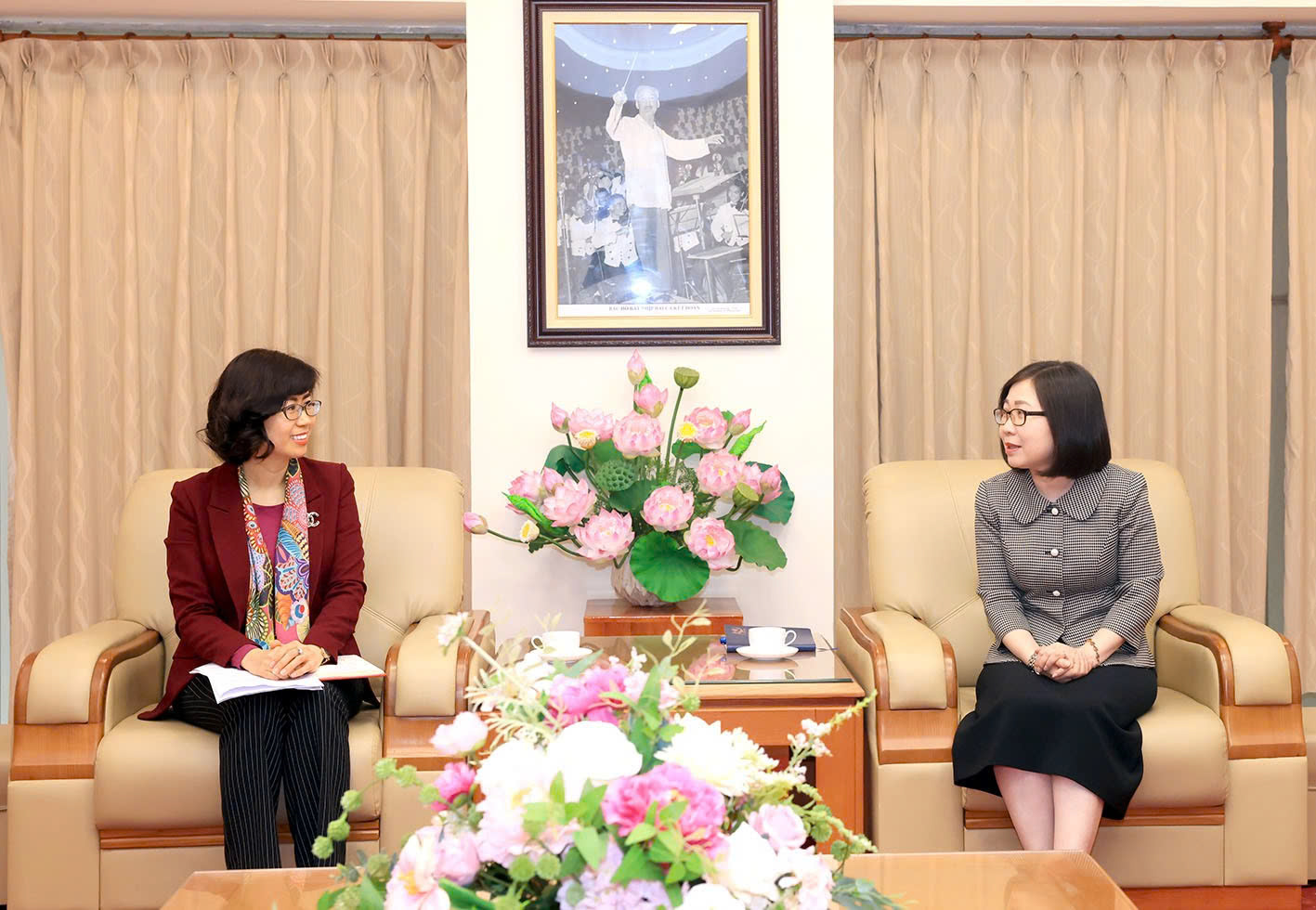 | Phó tổng giám đốc TTXVN Đoàn Thị Tuyết Nhung tiếp Tổng Thư ký Uỷ ban Quốc gia UNESCO Việt Nam, Cục trưởng Cục Ngoại vụ và Ngoại giao Văn hóa Lê Thị Hồng Vân, ngày 11/12 |