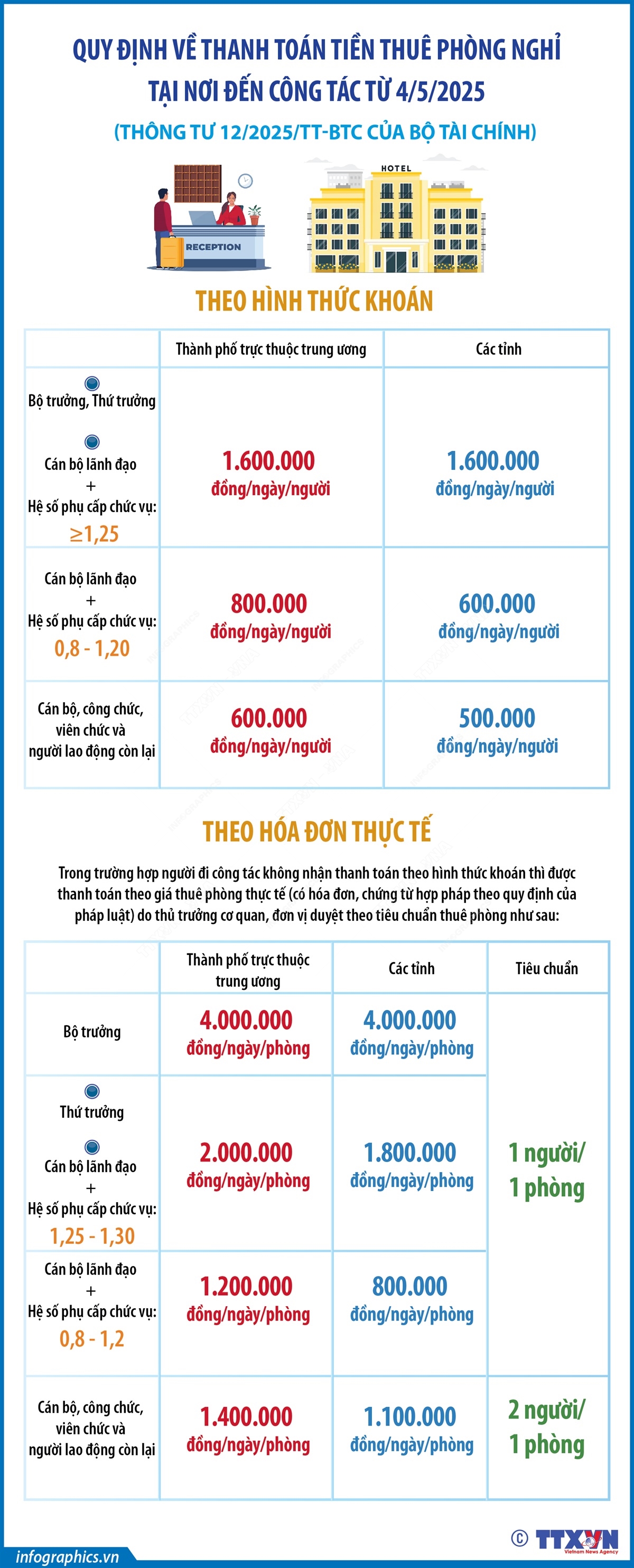 Hà Nội (TTXVN 4/5) Theo Thông tư 12/2025/TT-BTC ngày 19/3/2025 của Bộ Tài chính, từ 4/5/2025, mức khoán tiền thuê phòng nghỉ tại nơi đến công tác thấp nhất 500.000 đồng/ngày/người, cao nhất là 1.600.000 đồng/ngày/người; mức thanh toán theo hóa đơn thấp nhất là 1.100.000 đồng/ngày/phòng (tiêu chuẩn 2 người 1 phòng), cao nhất là 4.000.000 đồng/ngày/phòng (tiêu chuẩn 1 người 1 phòng), tùy theo đối tượng và nơi đến công tác.