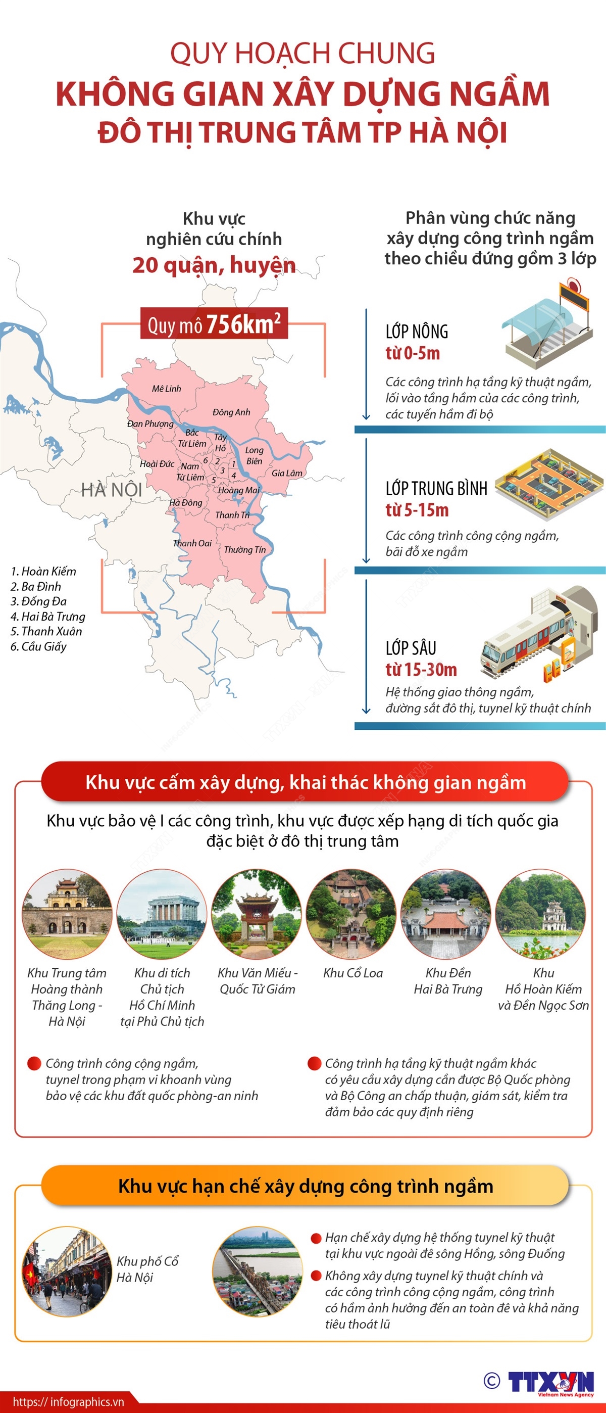 Theo Quy hoạch chung không gian xây dựng ngầm đô thị trung tâm - TP Hà Nội đến năm 2030, tầm nhìn đến năm 2050 của UBND TP Hà Nội, khu vực nghiên cứu chính của quy hoạch là đô thị trung tâm TP thuộc địa giới hành chính 20 quận, huyện (diện tích khoảng 756km2). Theo nguyên tắc chung, công trình xây dựng ngầm phải phù hợp với quy hoạch chung xây dựng Thủ đô Hà Nội, quy hoạch giao thông vận tải Thủ đô, các đồ án quy hoạch chuyên ngành hạ tầng kỹ thuật đã được Thủ tướng Chính phủ phê duyệt và các quy hoạch khác có liên quan.