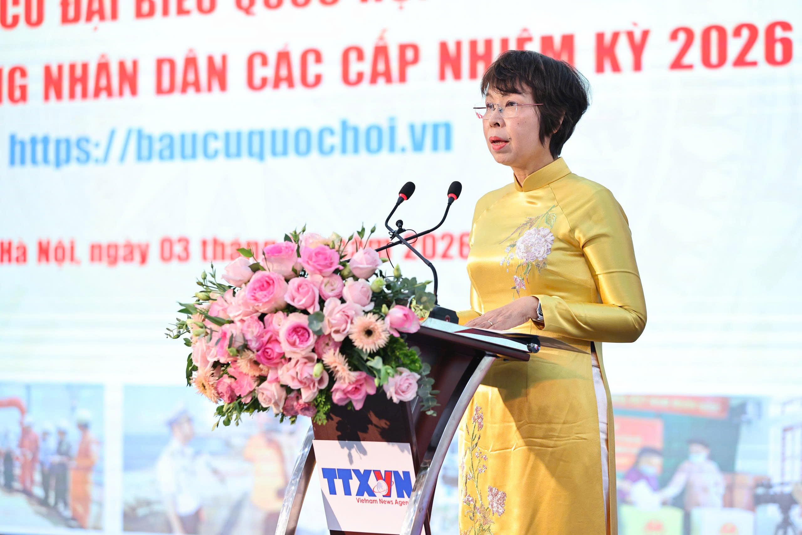 | Phó chủ tịch Quốc hội Nguyễn Thị Thanh và Tổng giám đốc TTXVN Vũ Việt Trang cùng các đại biểu thực hiện nghi thức khai trương Chuyên trang thông tin về bầu cử đại biểu Quốc hội khóa XVI và HĐND các cấp nhiệm kỳ 2026-2031, ngày 3/2 |