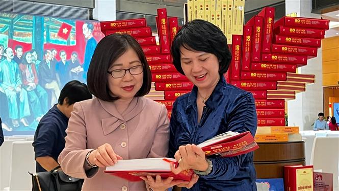 | Phó tổng giám đốc TTXVN Đoàn Thị Tuyết Nhung và Giám đốc nhà xuất bản Thông tấn Phùng Thị Mỹ xem sách ảnh song ngữ Việt - Anh “80 năm Quốc hội Việt Nam (1946-2026)" do Nhà xuất bản Thông tấn (TTXVN) phối hợp với Vụ Thông tin và Thư viện thuộc Văn phòng Quốc hội tổ chức biên soạn, xuất bản |