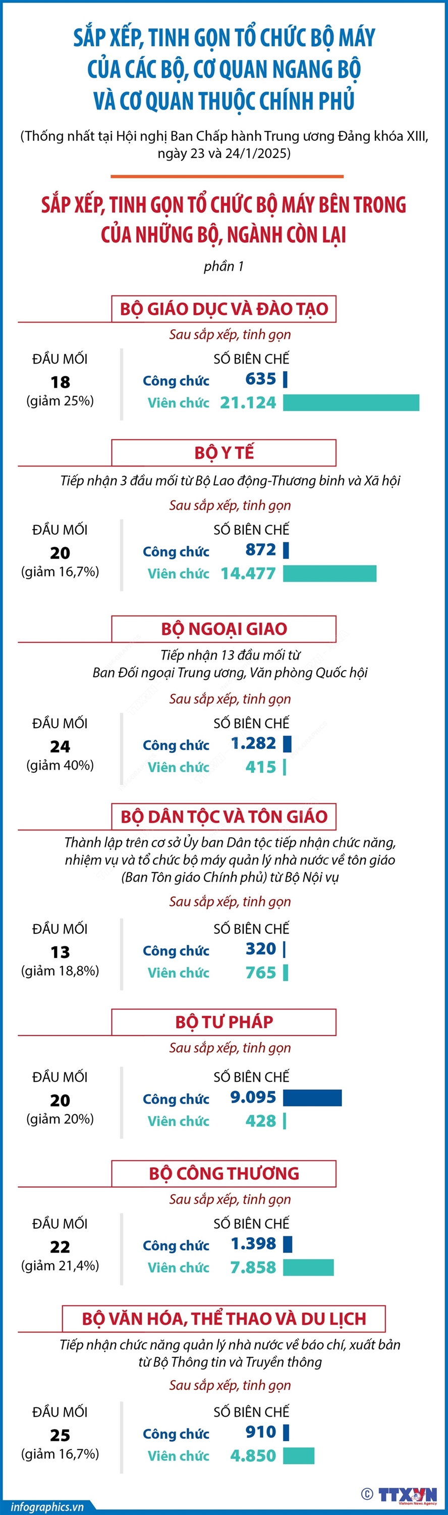 Ban Chấp hành Trung ương Đảng đã thông qua phương án sắp xếp, tinh gọn tổ chức bộ máy của hệ thống chính trị. Theo đó, đối với các cơ quan của Chính phủ, hợp nhất 10 bộ thành 5 bộ. Trong đó, hợp nhất Bộ Kế hoạch và Đầu tư và Bộ Tài chính thành Bộ Tài chính; Bộ Xây dựng và Bộ Giao thông vận tải thành Bộ Xây dựng; Bộ Nông nghiệp và Phát triển nông thôn và Bộ Tài nguyên và Môi trường thành Bộ Nông nghiệp và Môi trường; Bộ Thông tin và Truyền thông và Bộ Khoa học và Công nghệ thành Bộ Khoa học và Công nghệ; Bộ Lao động - Thương binh và Xã hội và Bộ Nội vụ thành Bộ Nội vụ. Thành lập Bộ Dân tộc và Tôn giáo trên cơ sở Ủy ban Dân tộc tiếp nhận thêm chức năng, nhiệm vụ và tổ chức bộ máy quản lý nhà nước về tôn giáo từ Bộ Nội vụ. Với những bộ, ngành còn lại thực hiện sắp xếp, tinh gọn tổ chức bộ máy bên trong.