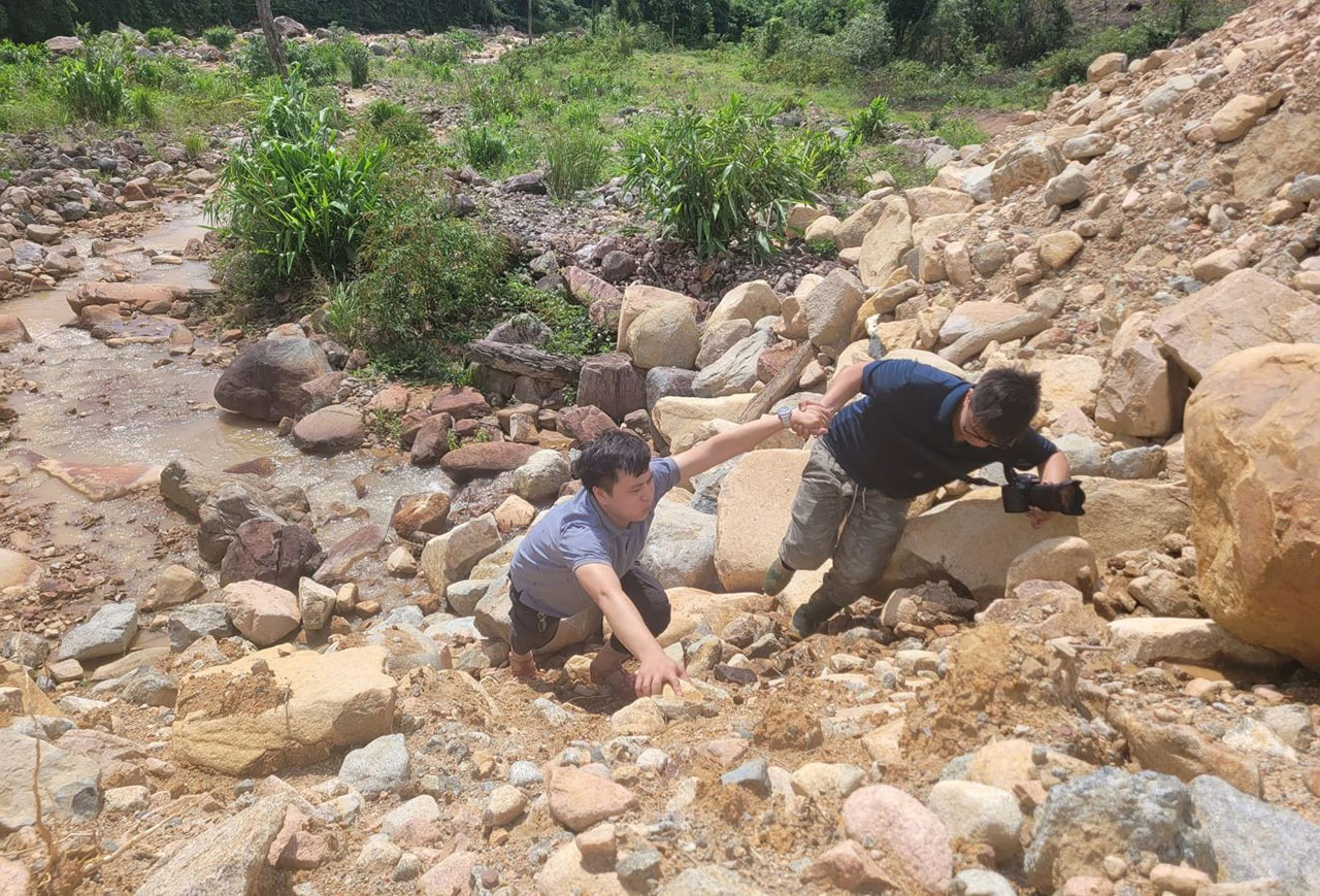 | Các phóng viên Võ Mạnh Hùng và Nguyễn Hoài Nam, báo điện tử VietnamPlus, tại khu vực sạt lở nghiêm trọng xã Hướng Sơn, huyện Hướng Hóa, tỉnh Quảng Trị, tháng 9/2023 |