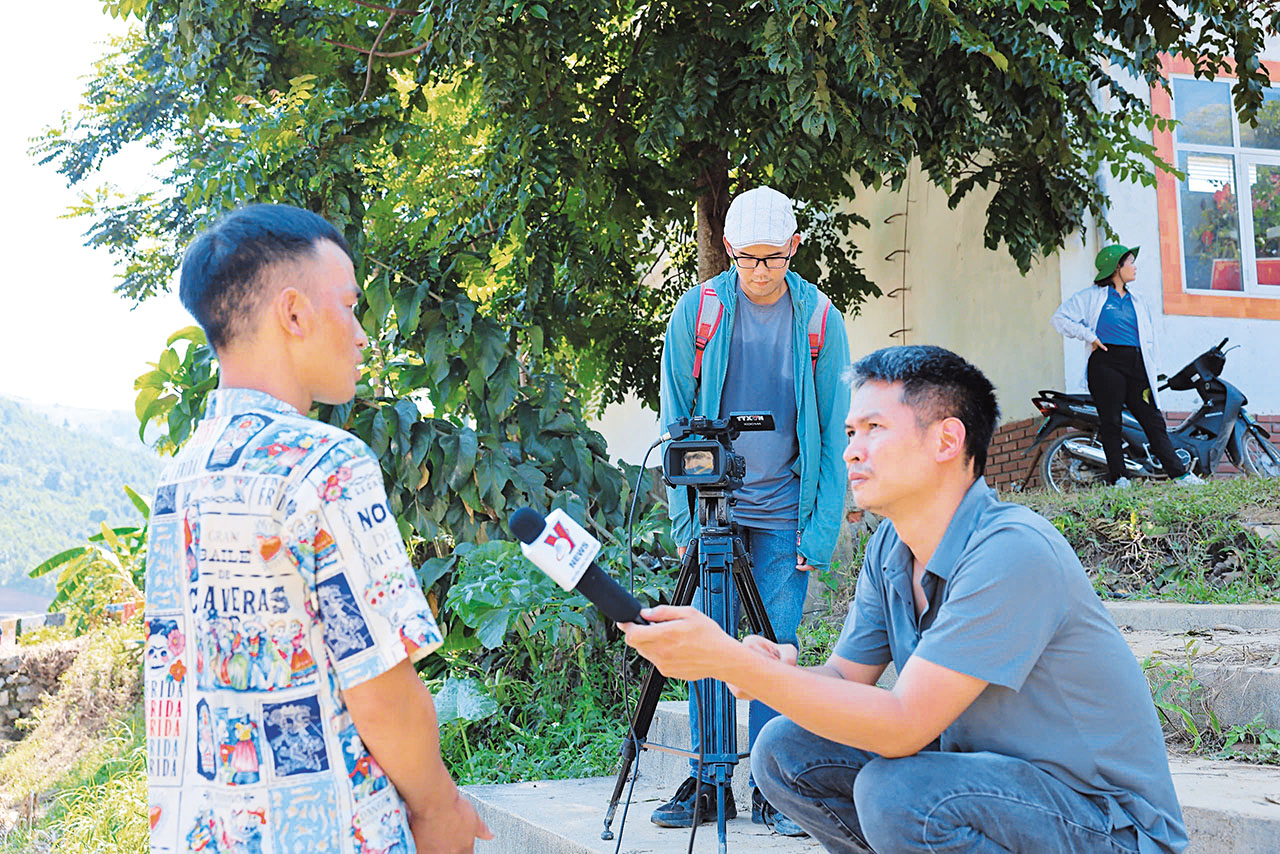 | Phóng viên Phùng Nam Sương, Ban biên tập tin Trong nước, phỏng vấn người dân chịu ảnh hưởng bởi cơn bão Yagi tại xã Nậm Lúc, huyện Bắc Hà, tỉnh Lào Cai, tháng 9/2024 |