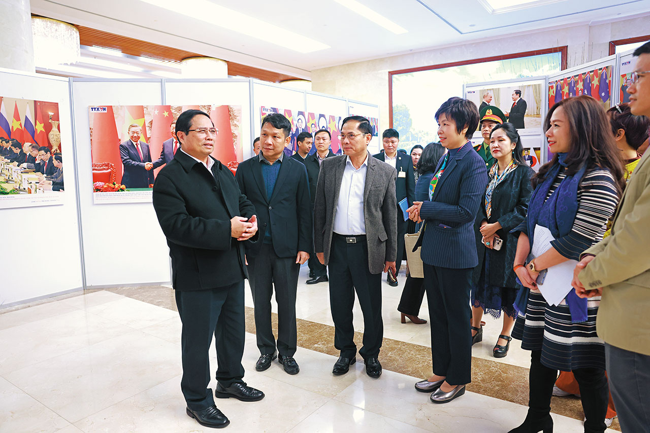 | Thủ tướng Phạm Minh Chính; Phó Thủ tướng, Bộ trưởng Bộ Ngoại giao Bùi Thanh Sơn và Tổng giám đốc TTXVN Vũ Việt Trang tại buổi tổng duyệt trưng bày ảnh phục vụ lễ tiếp đón, chiêu đãi các đoàn ngoại giao nhân dịp năm mới 2025 |