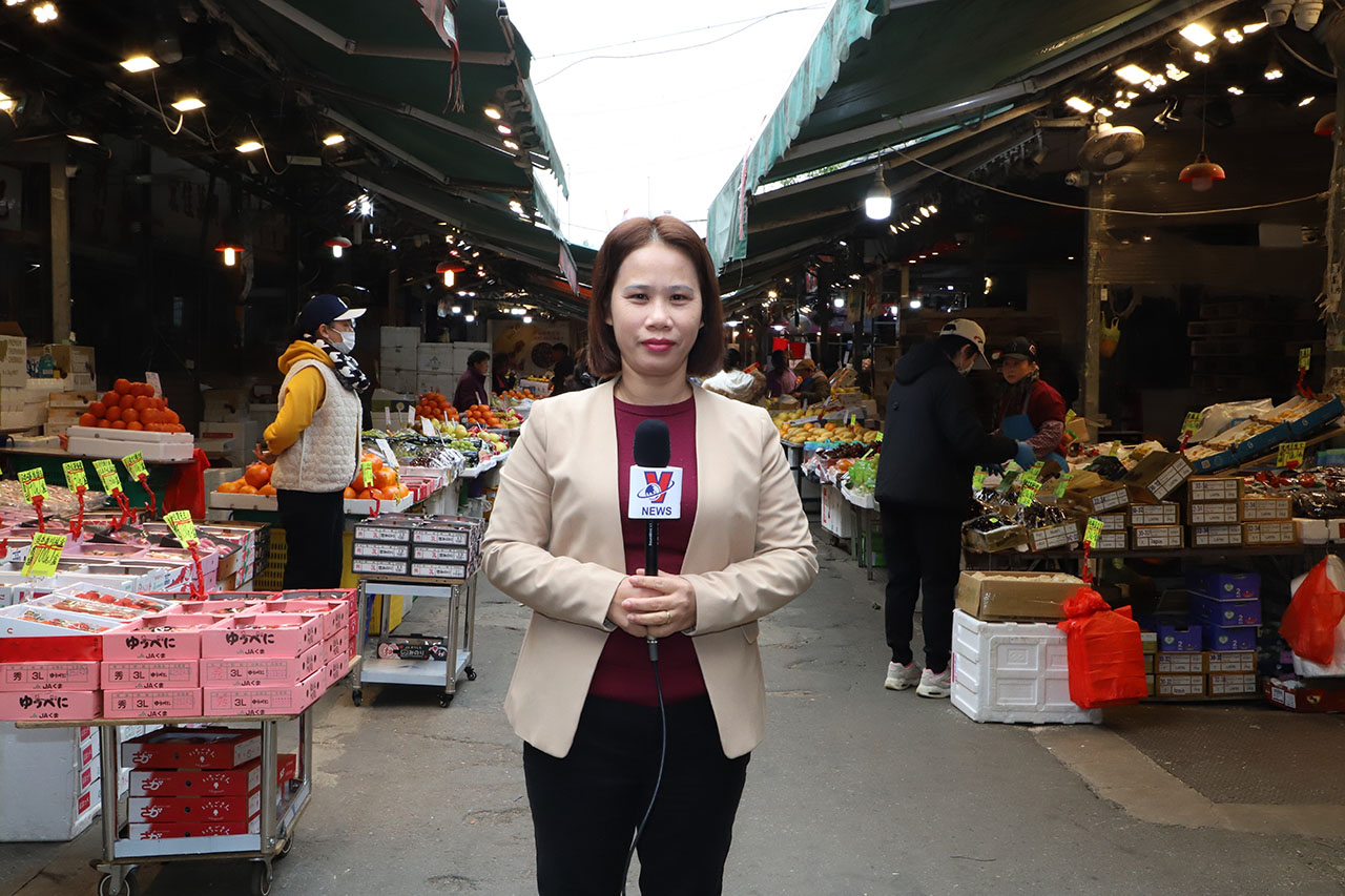 | Trưởng Cơ quan thường trú TTXVN tại Hong Kong Mạc Thị Luyện dẫn hiện trường tại chợ trái cây Yau Ma Tei những ngày giáp Tết nguyên đán 2025 |