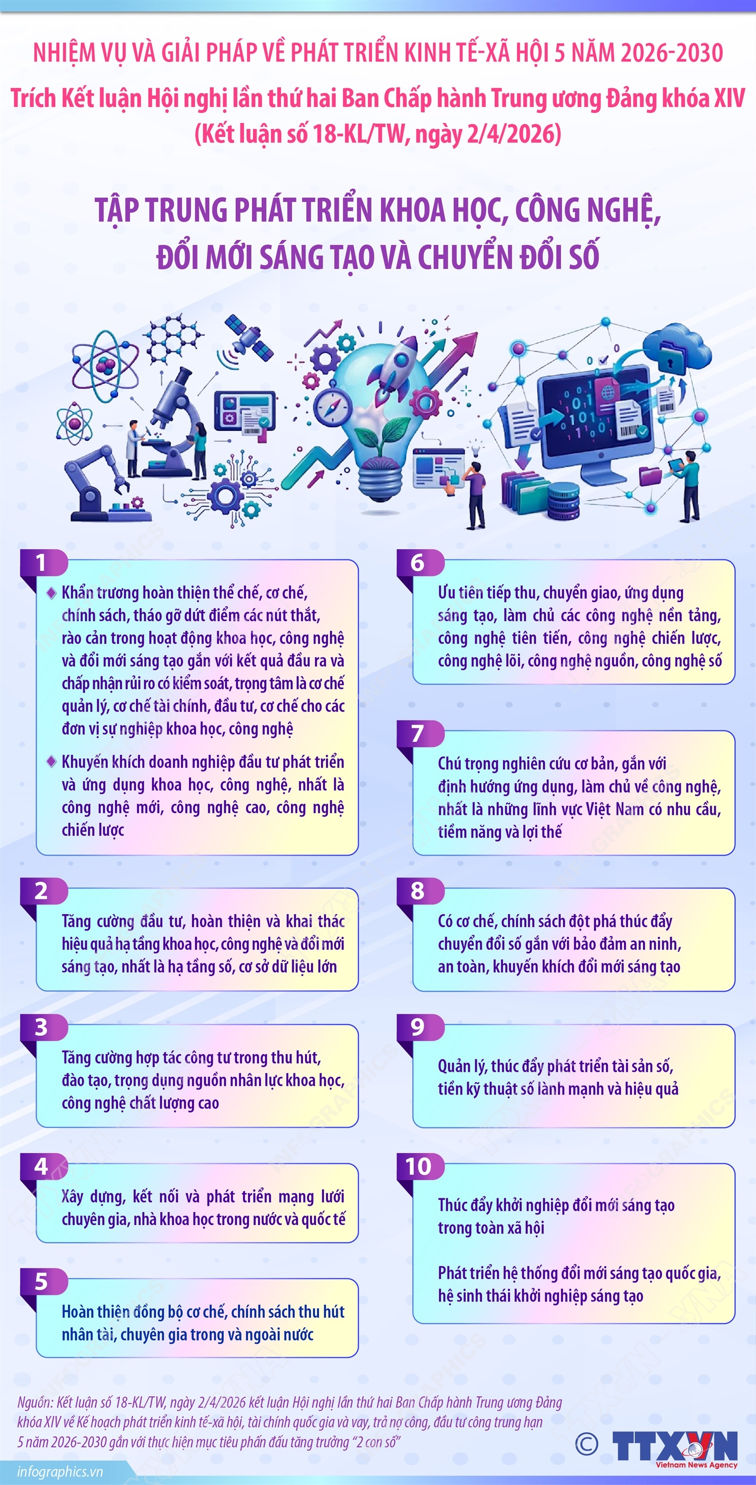 Tập trung phát triển khoa học, công nghệ, đổi mới sáng tạo và chuyển đổi số (trích Kết luận số 18-KL/TW, ngày 2/4/2026)
