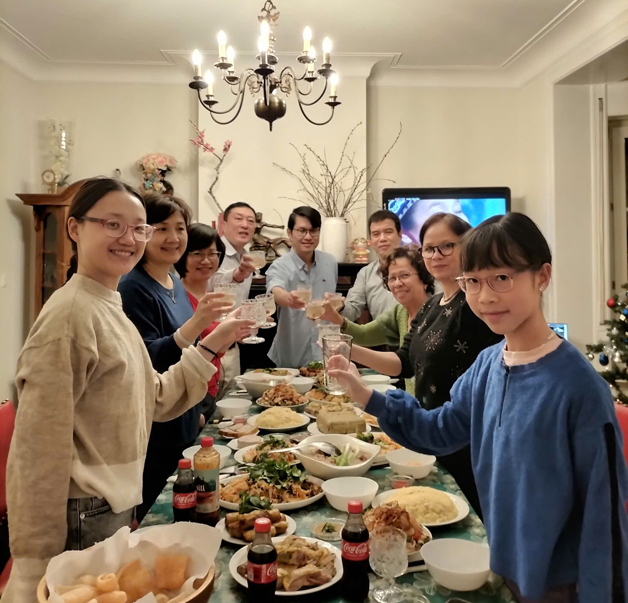Trong góc phòng, cây thông Noel từ dịp Giáng sinh vẫn lấp lánh ánh đèn nhấp nháy. Có lẽ đây là sự giao thoa thú vị giữa hai nền văn hóa, khi mùa lễ hội phương Tây hòa quyện với không khí Tết cổ truyền của Việt Nam. Chúng tôi ngồi quây quần bên nhau, nâng ly chúc mừng năm mới, thưởng thức những món ăn quen thuộc và chia sẻ những câu chuyện dài mãi không dứt. Ai cũng hiểu rằng, nơi xứ người, tình đồng nghiệp và bạn bè chính là gia đình. Cảm giác xa quê hương dường như nhẹ bớt, nhường chỗ cho sự ấm áp của tình thân, của sự sẻ chia trong những ngày đặc biệt nhất của năm.
