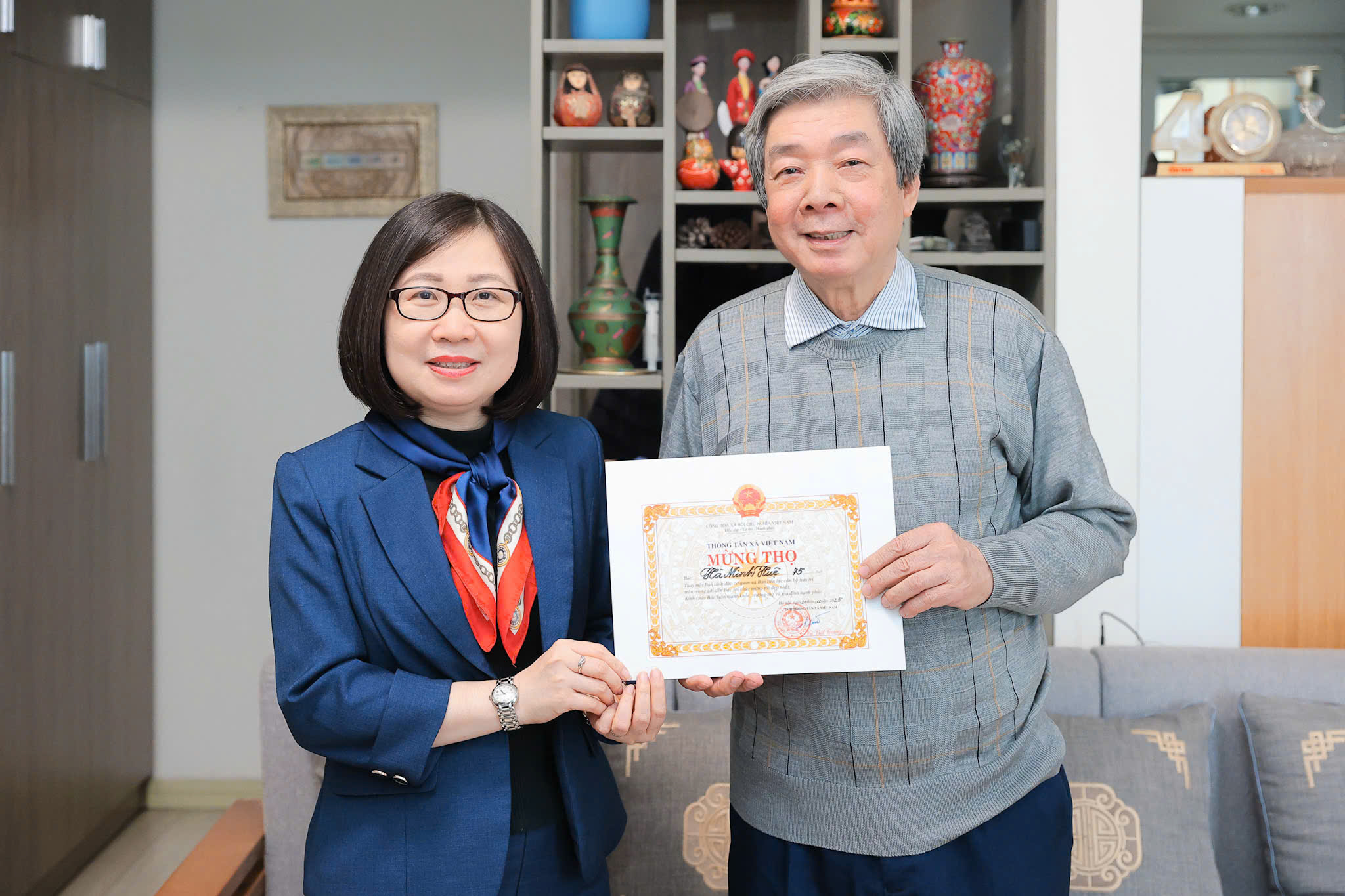 ![]() Phó tổng giám đốc TTXVN Đoàn Thị Tuyết Nhung chúc Tết và mừng thọ nguyên Phó tổng giám đốc TTXVN Hà Minh Huệ, tháng 2/2026 |