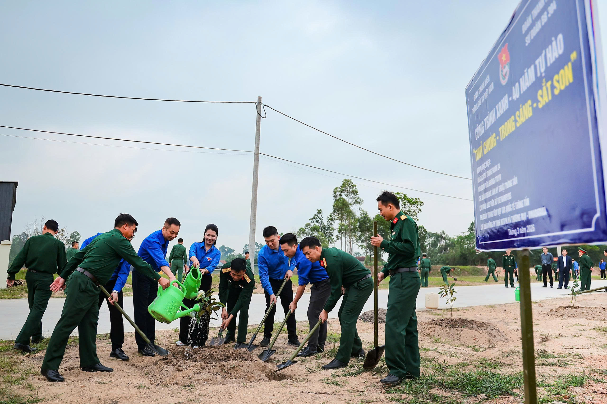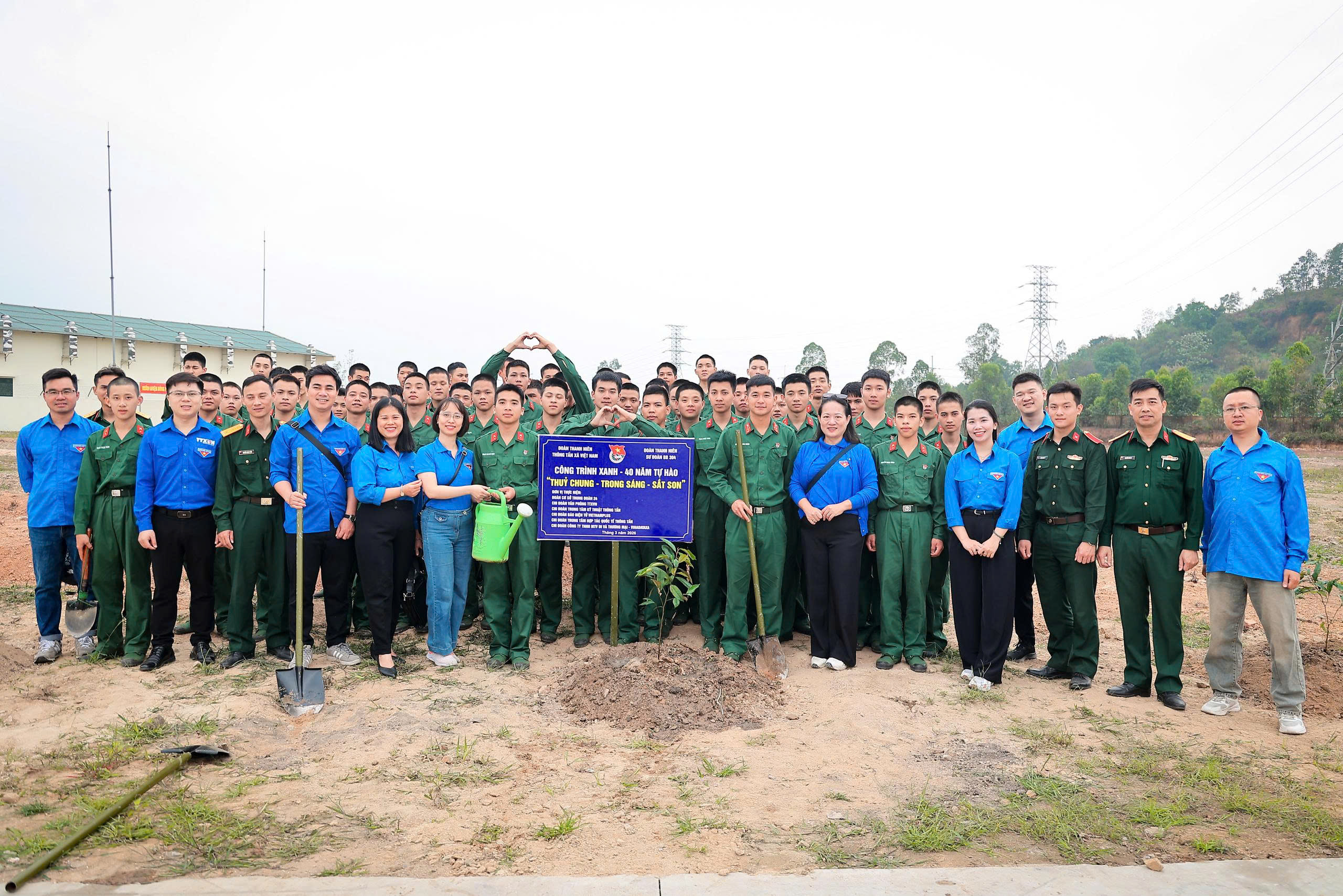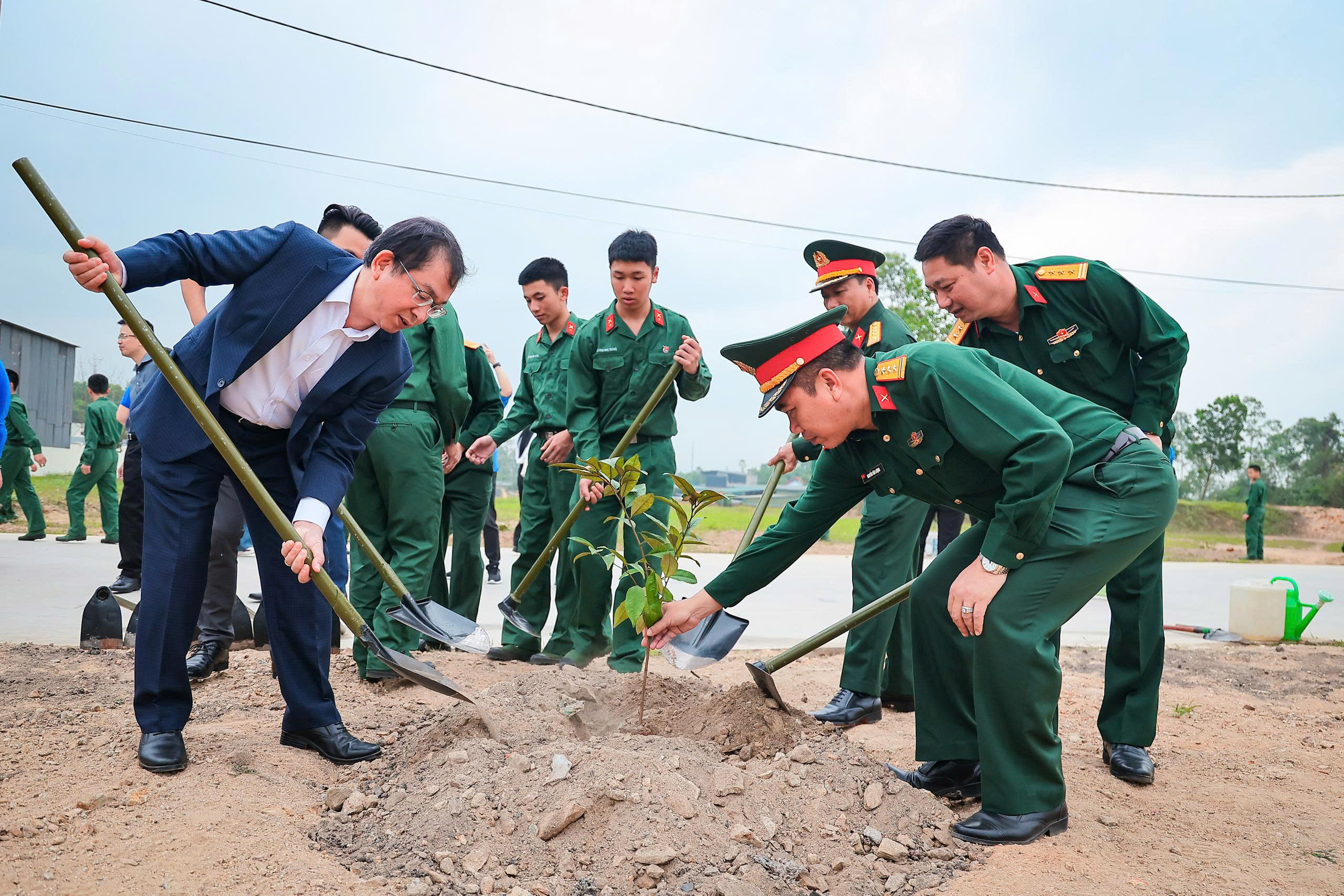 | Lãnh đạo và đoàn viên thanh niên TTXVN và Sư đoàn 304 trồng cây tại Chương trình giao lưu "Gắn kết nghĩa tình - Vững bước sắt son", ngày 21/3 |