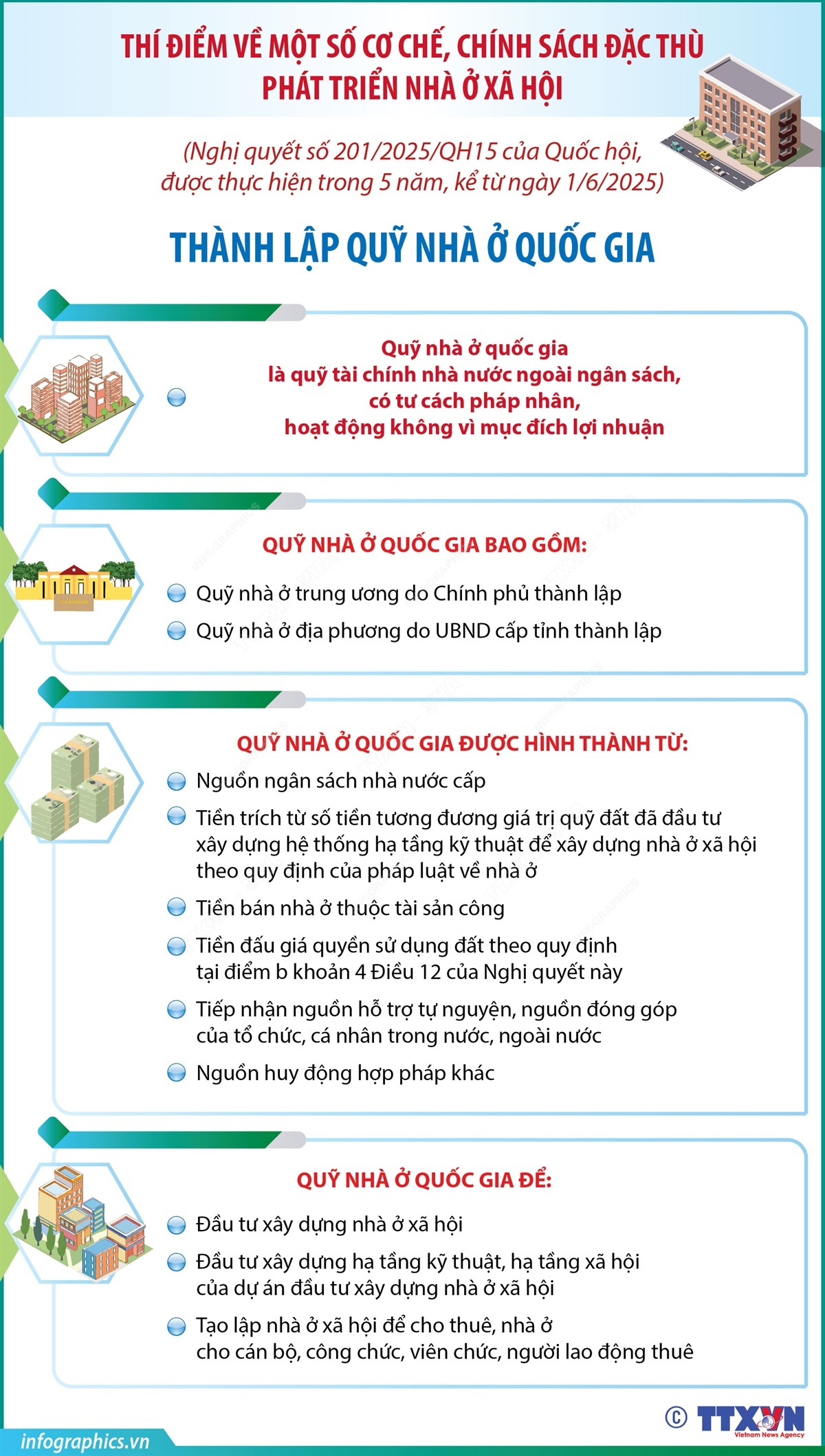 Hà Nội (TTXVN 4/6) Nghị quyết số 201/2025/QH15 thí điểm về một số cơ chế, chính sách đặc thù phát triển nhà ở xã hội được thực hiện trong 5 năm, kể từ ngày 1/6/2025. Một trong điểm đáng chú ý của Nghị quyết là quy định về Quỹ nhà ở quốc gia. Quỹ nhà ở quốc gia là quỹ tài chính nhà nước ngoài ngân sách, có tư cách pháp nhân, hoạt động không vì mục đích lợi nhuận. Quỹ nhà ở quốc gia để đầu tư xây dựng nhà ở xã hội, đầu tư xây dựng hạ tầng kỹ thuật, hạ tầng xã hội của dự án đầu tư xây dựng nhà ở xã hội, tạo lập nhà ở xã hội để cho thuê, nhà ở cho cán bộ, công chức, viên chức, người lao động thuê.