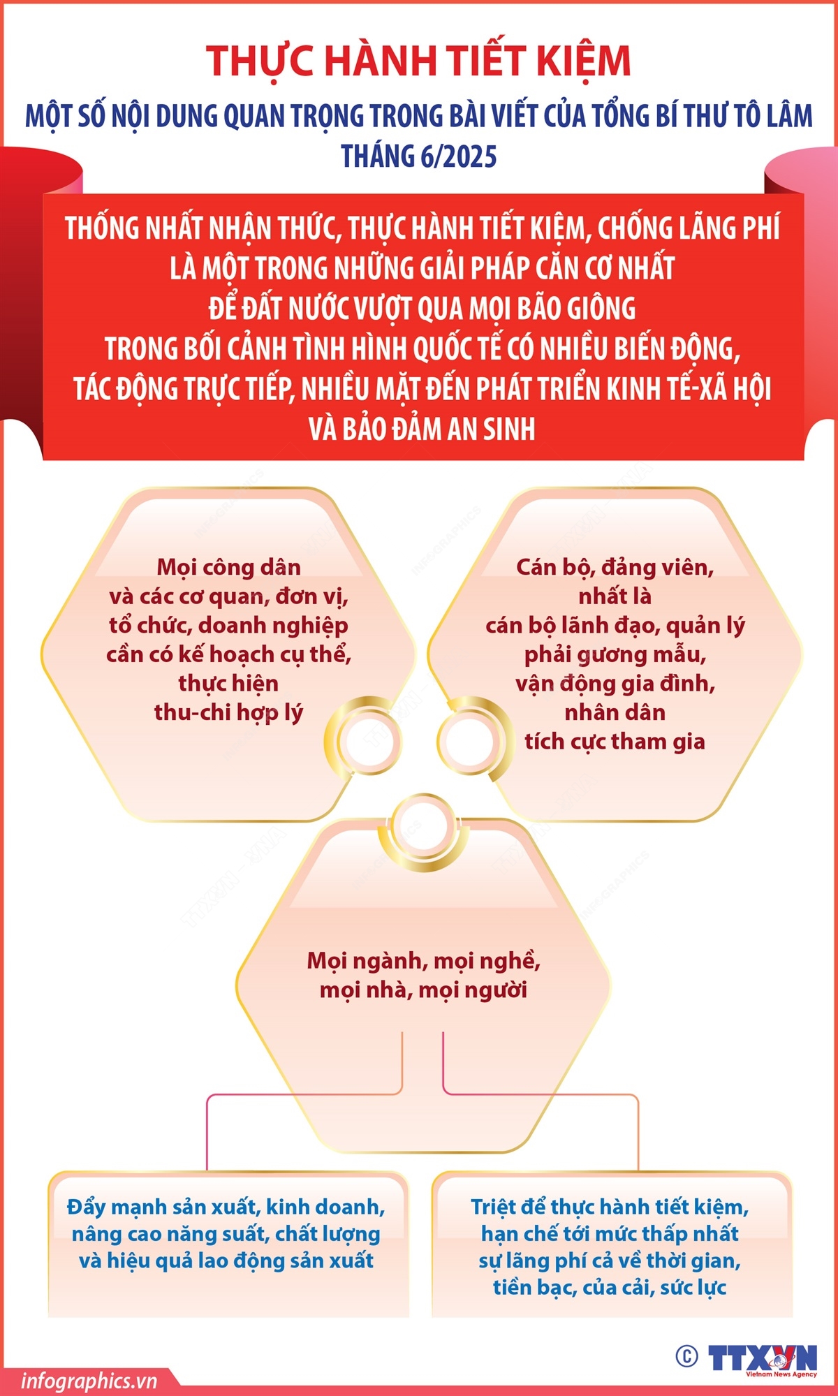 Hà Nội (TTXVN 1/6) Trong bài viết “Thực hành tiết kiệm” viết ngày 1/6/2025, Tổng Bí thư Tô Lâm nhấn mạnh cần tập trung thực hiện tốt vấn đề: Thống nhất nhận thức, thực hành tiết kiệm, chống lãng phí là một trong những giải pháp căn cơ nhất để đất nước vượt qua mọi bão giông trong bối cảnh tình hình quốc tế có nhiều biến động, tác động trực tiếp, nhiều mặt đến phát triển kinh tế- xã hội và bảo đảm an sinh. Mọi công dân và các cơ quan, đơn vị, tổ chức, doanh nghiệp cần có kế hoạch cụ thể, thực hiện thu-chi hợp lý; cán bộ, đảng viên, nhất là cán bộ lãnh đạo, quản lý phải gương mẫu, vận động gia đình, nhân dân tích cực tham gia; mọi ngành, mọi nghề, mọi nhà, mọi người đẩy mạnh sản xuất, kinh doanh, nâng cao năng suất, chất lượng và hiệu quả lao động sản xuất, triệt để thực hành tiết kiệm, hạn chế tới mức thấp nhất sự lãng phí cả về thời gian, tiền bạc, của cải, sức lực.